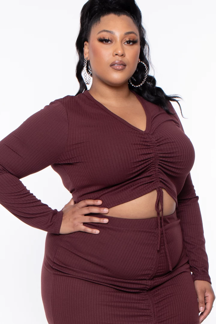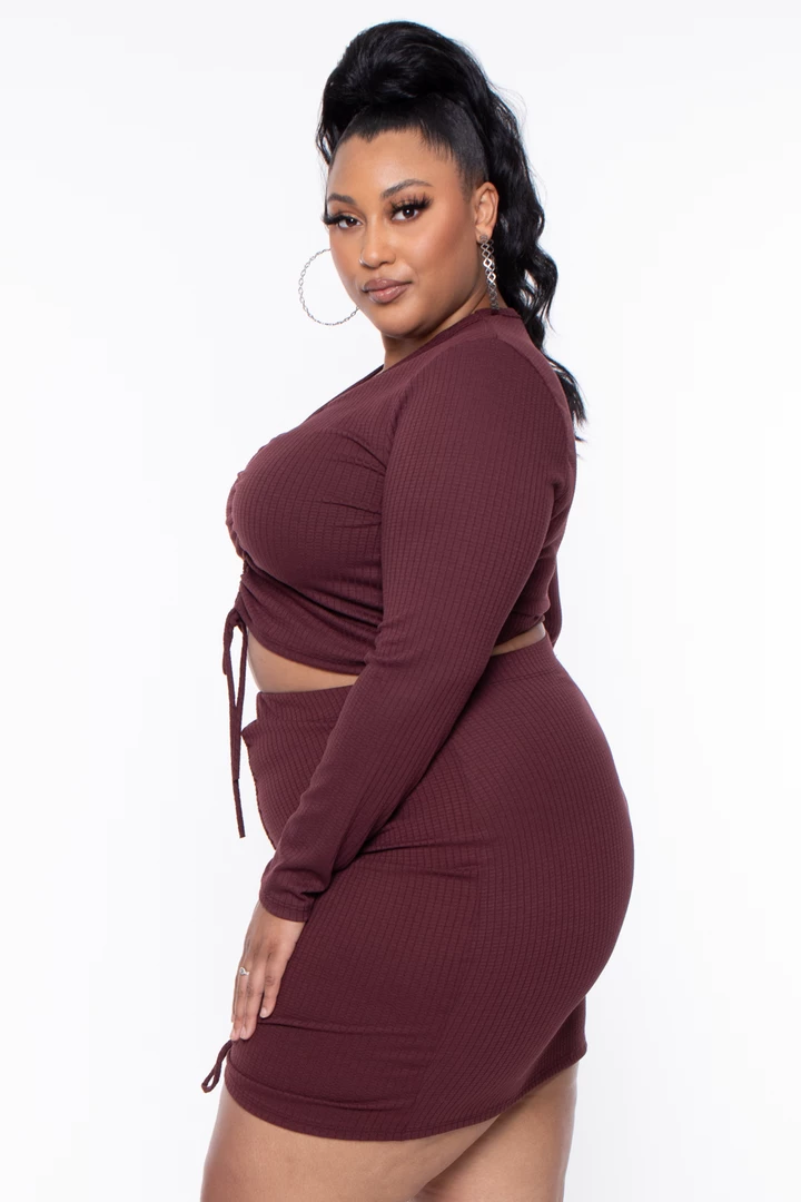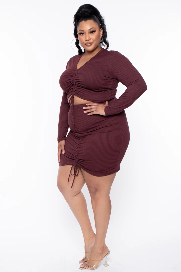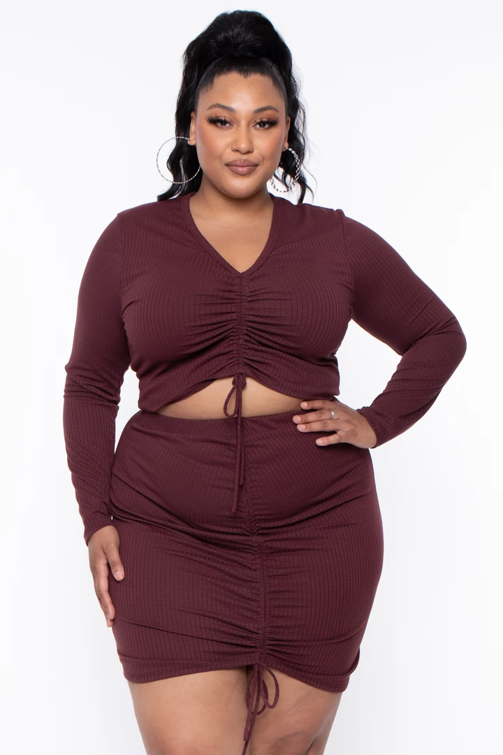 This plus size knit matching set features a top with a V-neckline, long sleeves, and cropped hem with front ruched detail as well as a mini skirt with ruched front detail and a bodycon silhouette.