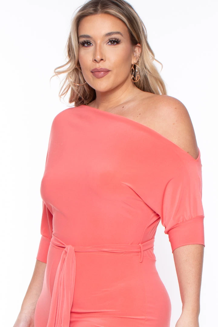This plus size, stretch jumpsuit features an off the shoulder neckline, 3/4 dolman sleeves banded, with a removable self-tie belt, form-fitted, and a flared leg.