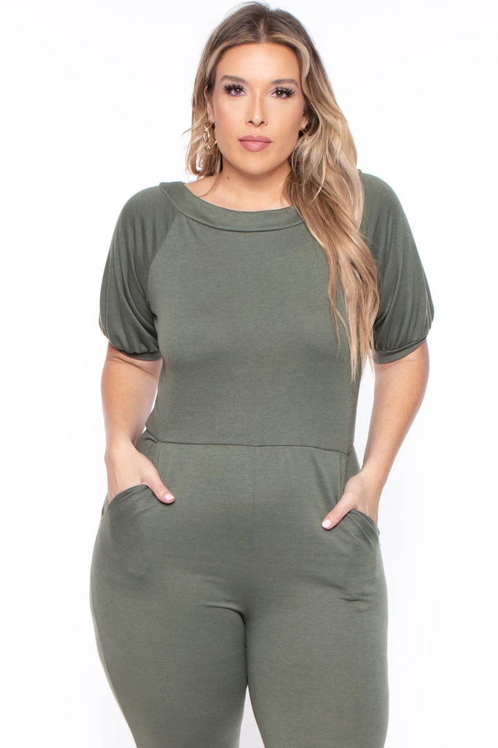 This plus size, jumpsuit features a boat neckline, three quarter puffed sleeves and small keyhole back with double dome button closure and ruching detail at pant hemline