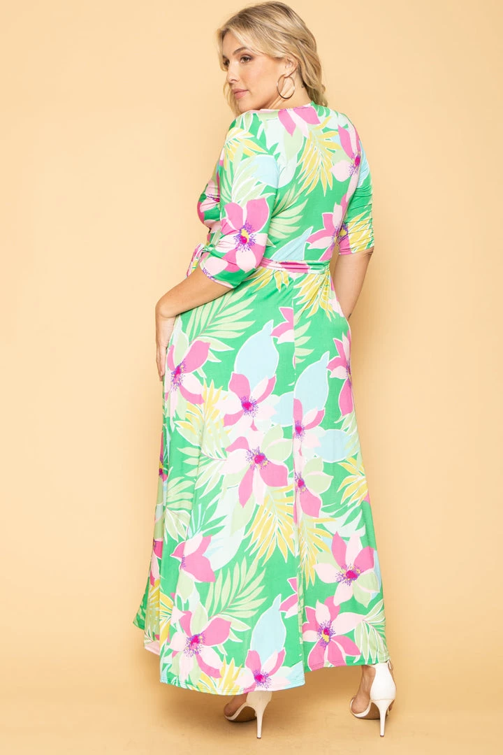 This plus size, stretch knit maxi dress features a multi color tropical floral print, v neckline wrap front bodice, three quarter sleeves and adjustable tie sash at the waist.