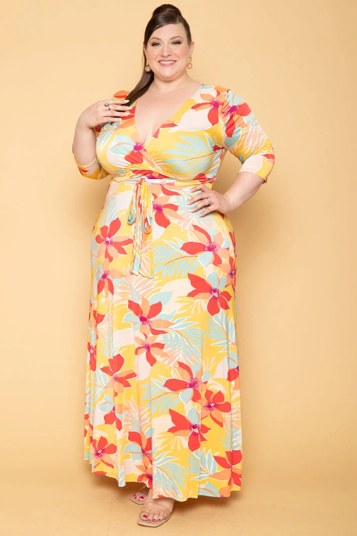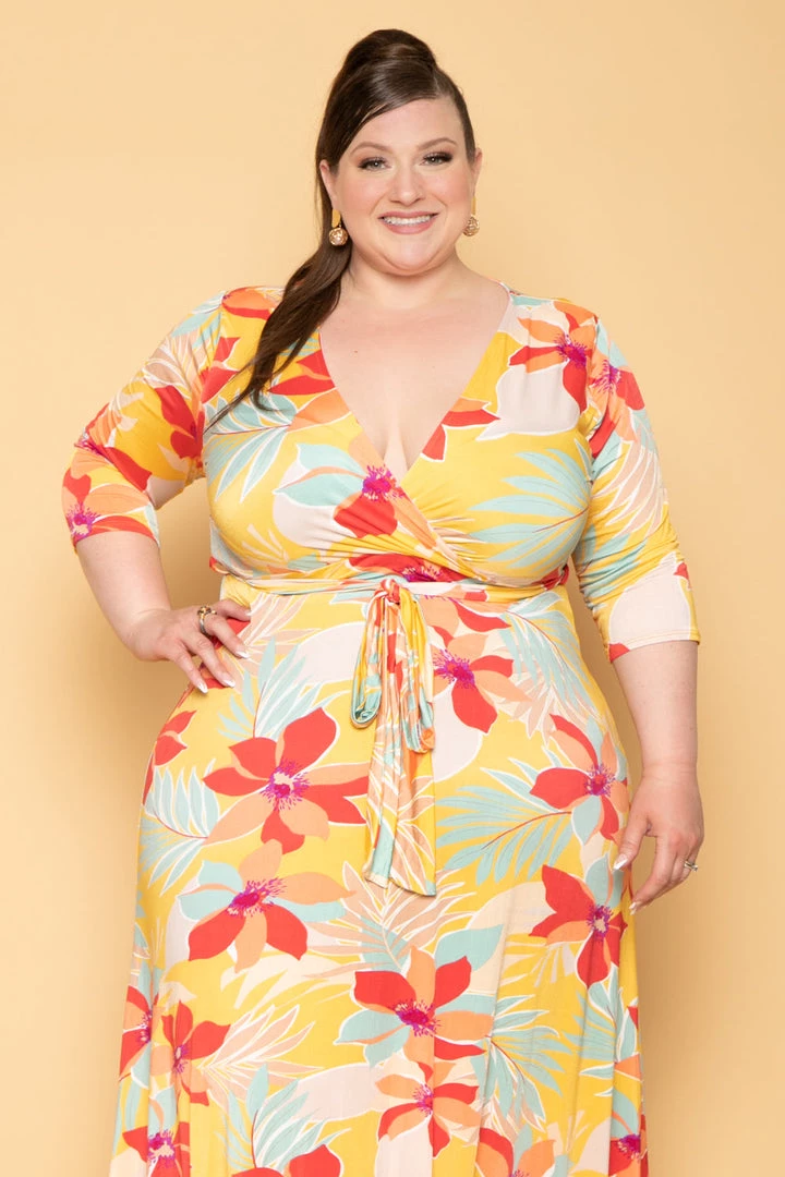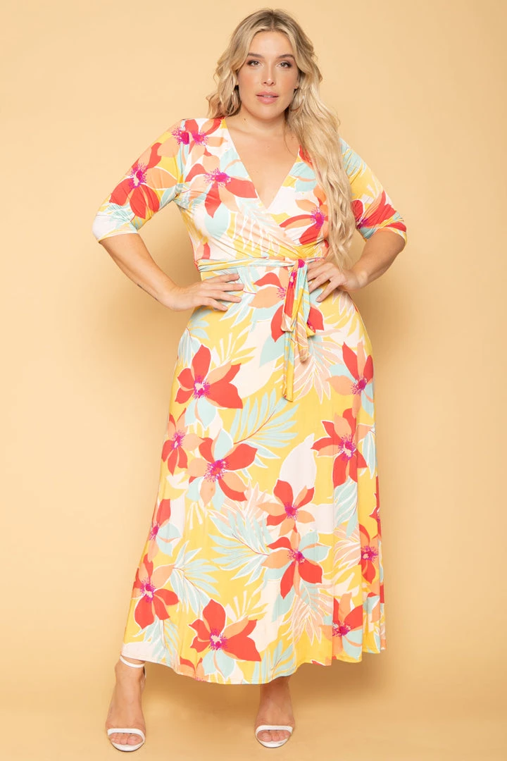 This plus size, stretch knit maxi dress features a multi color tropical floral print, v neckline wrap front bodice, three quarter sleeves and adjustable tie sash at the waist.