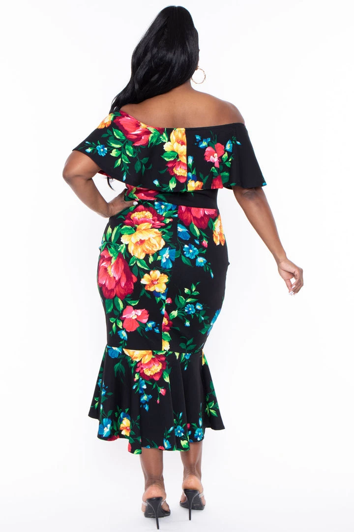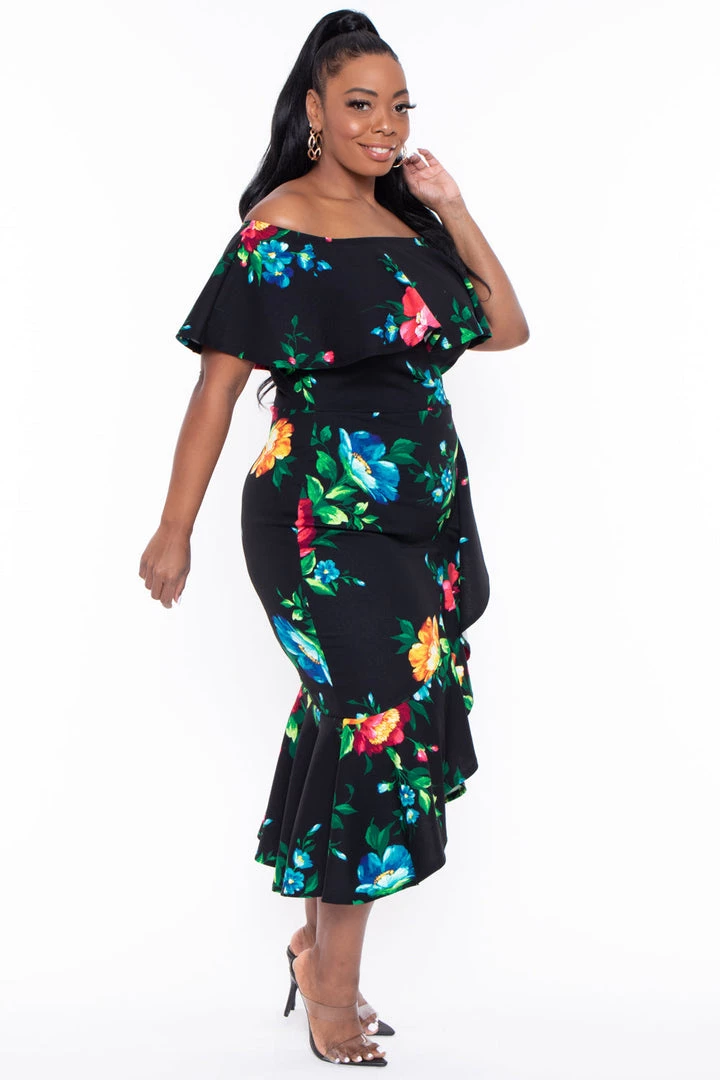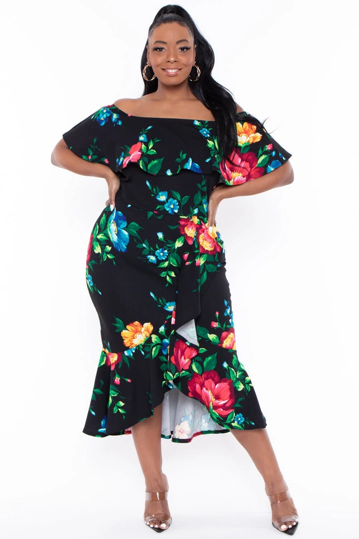 This plus size, off the shoulder dress features ruffle detailing throughout the dress on the neckline and wrap front hemline, and all over bright floral design
