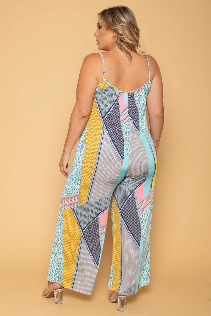 This plus size, jumpsuit features a bold abstract print, loose fit that streamlines your look and comes with pockets