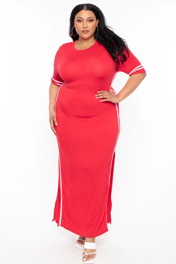 This plus size, stretch knit dress features a scoop neckline, short sleeves with sporty varsity-striped and side strips to the hem side slits, and a bodycon silhouette.