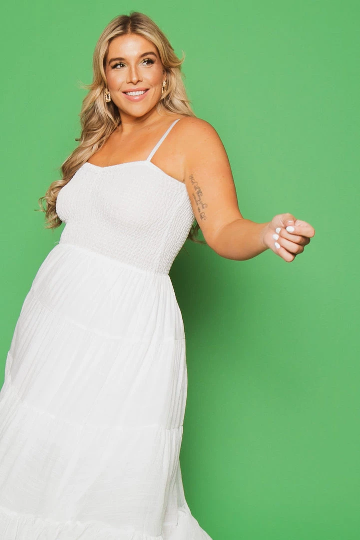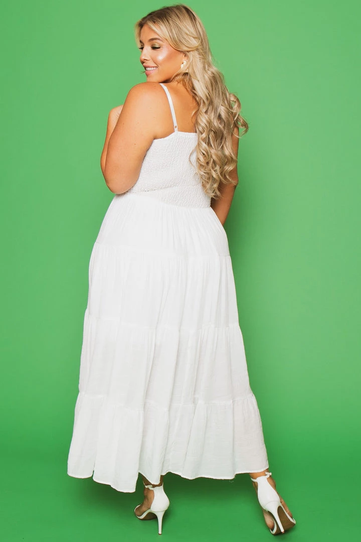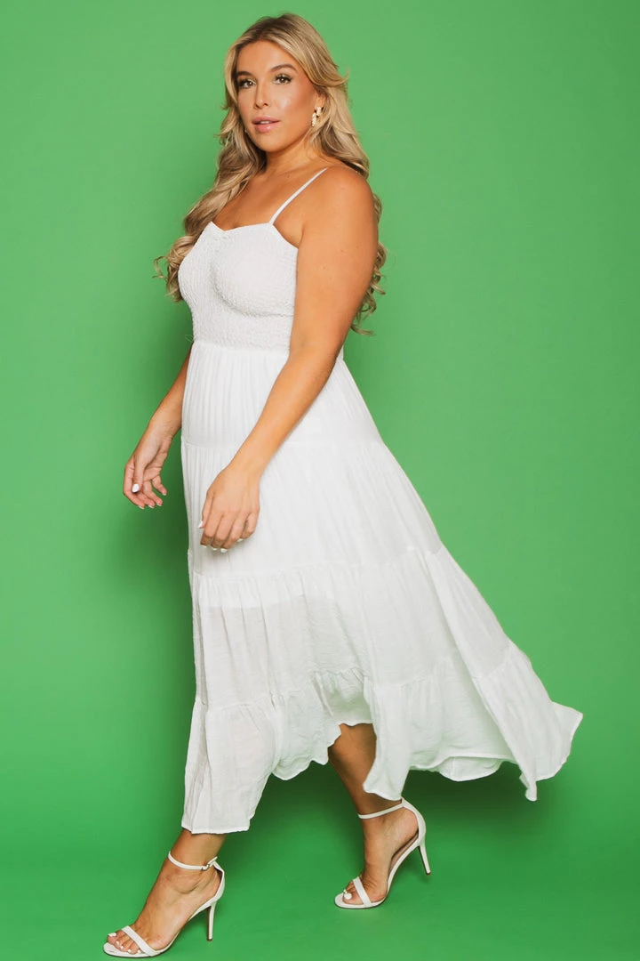 This plus size stretch boho style dress features a smocked top neckline with adjustable spaghetti straps , a flowy maxi with a tier design ruffle hem and inner mini skirt lining