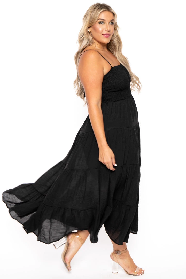 This plus size stretch boho style dress features a smocked top neckline with adjustable spaghetti straps , a flowy maxi with a tier design ruffle hem and inner mini skirt lining