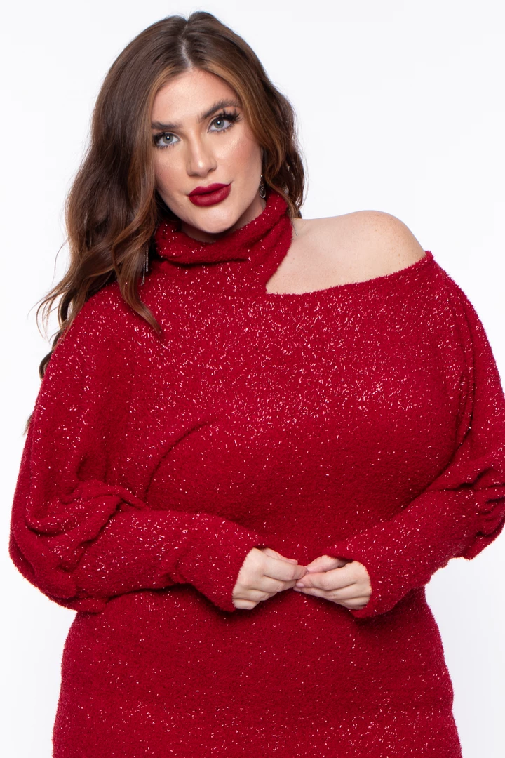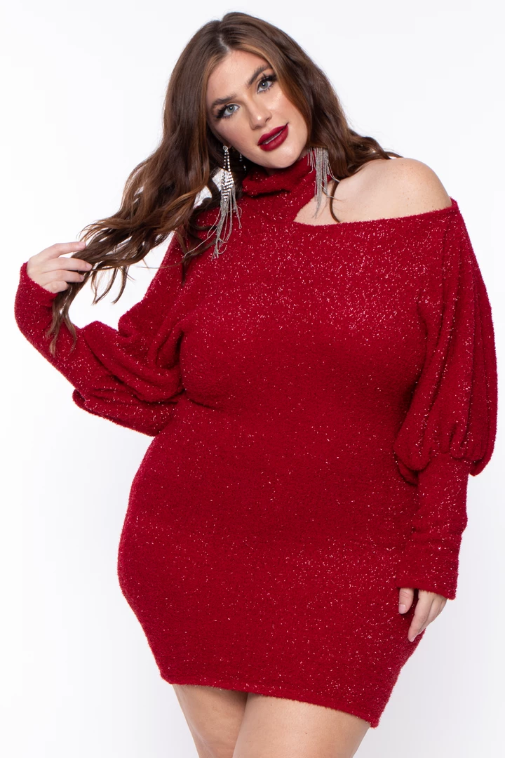 This plus size, stretch knit dress features an off the shoulder neckline, mock collar long dolman sleeves, self cuffed and a bodycon silhouette and faux texture.