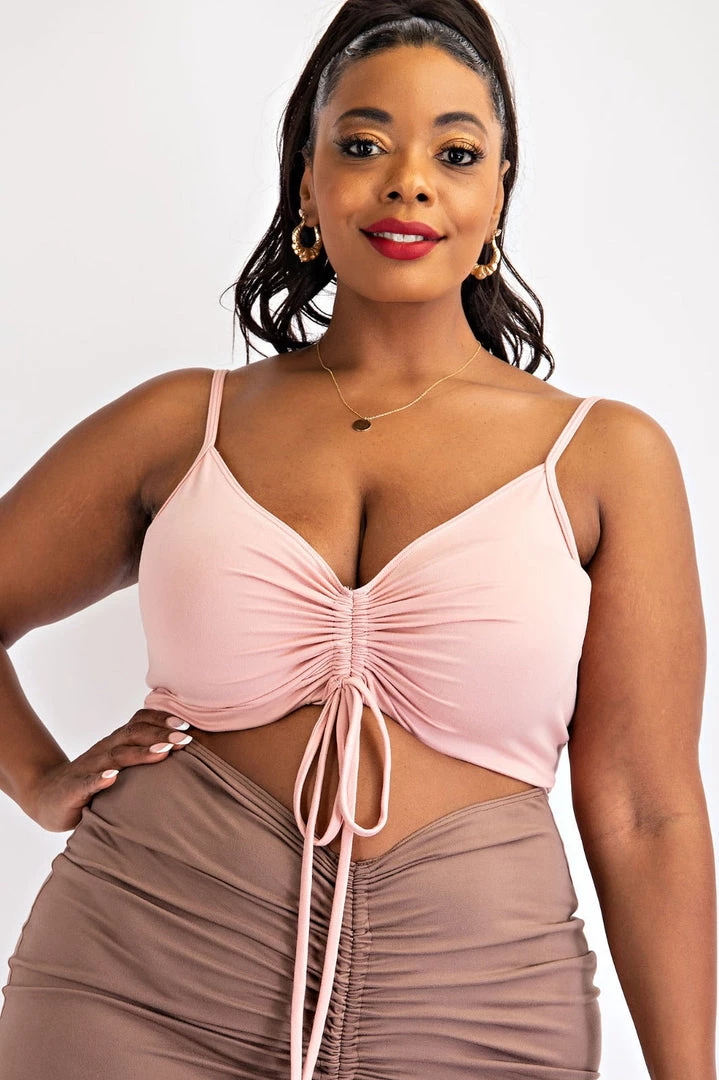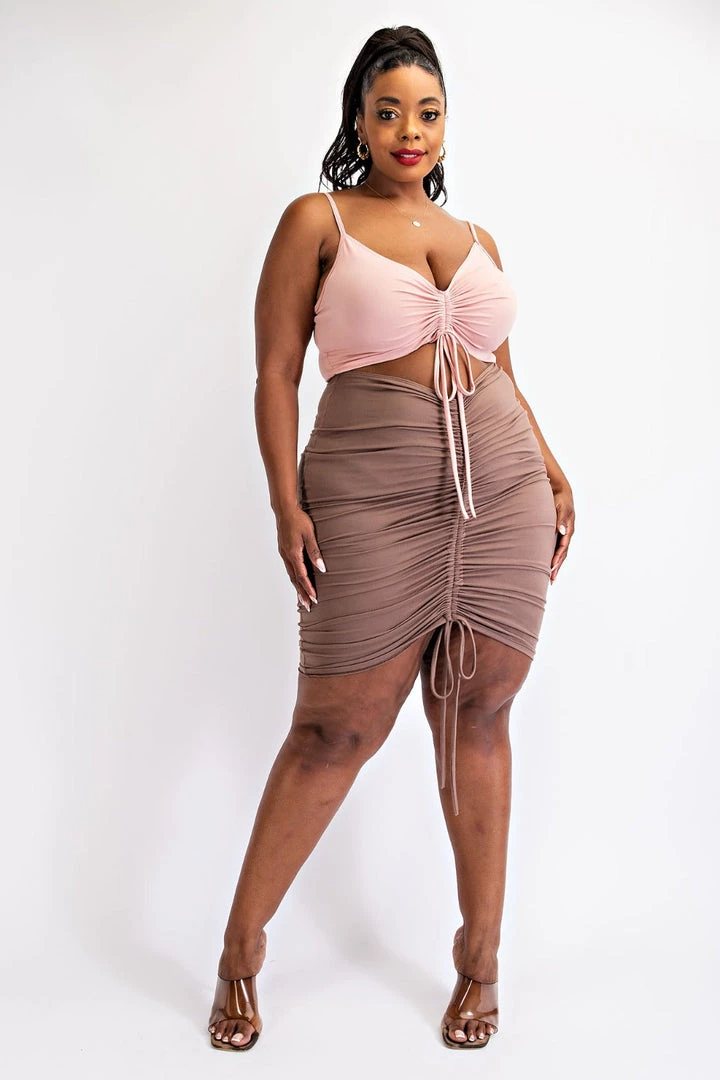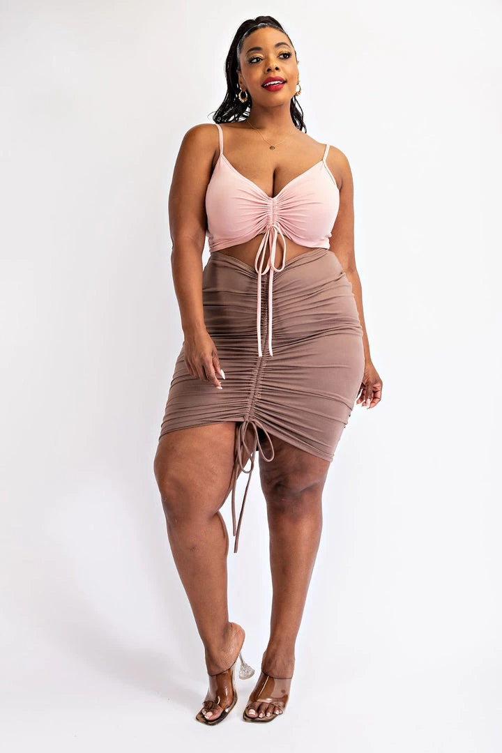 This plus size, bodycon dress features ruched detailing for a curve hugging silhouette, adjustable ruching detail, and deep v neckline with a front cutout