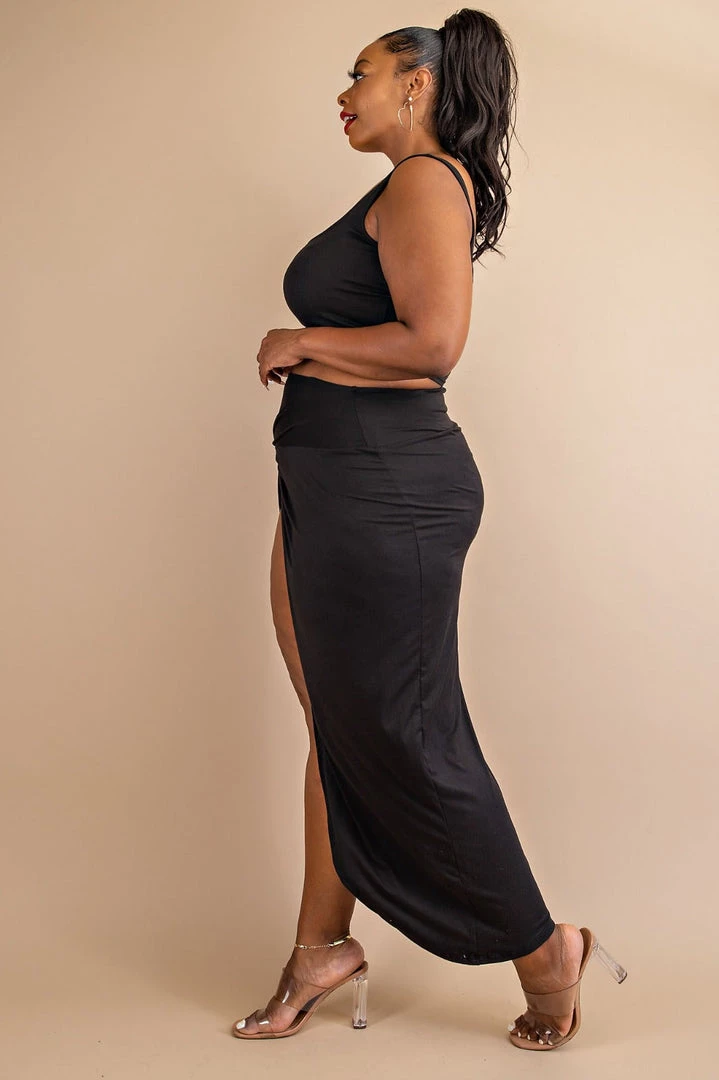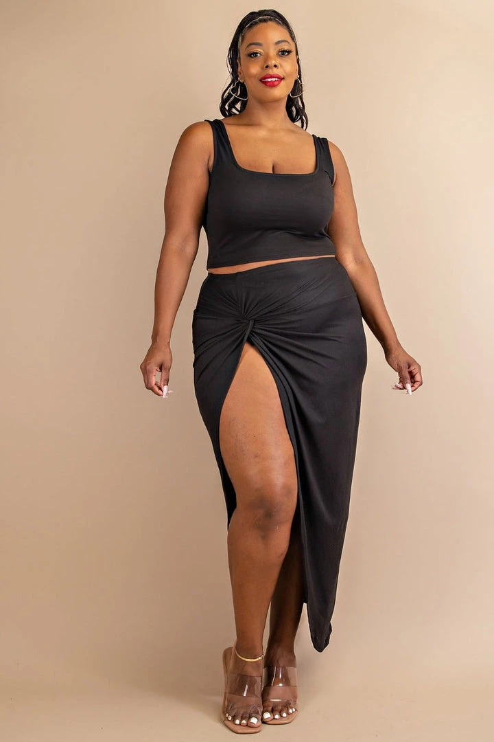 This plus size, matching skirt set features incredibly soft material to slide over your curves, crop top with a scoop neckline and midi skirt with high thigh slit