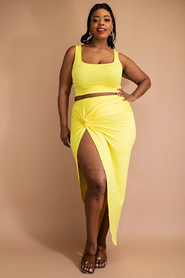 This plus size, matching skirt set features incredibly soft material to slide over your curves, crop top with a scoop neckline and midi skirt with high thigh slit
