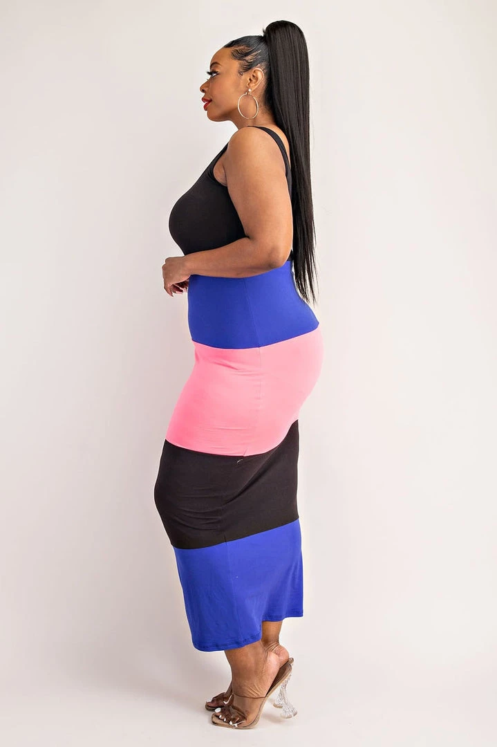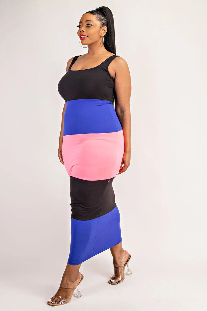 This plus size, maxi dress features a vibrant colorblocking design with royal blue, fuchsia and black, strapless with a scoop neckline