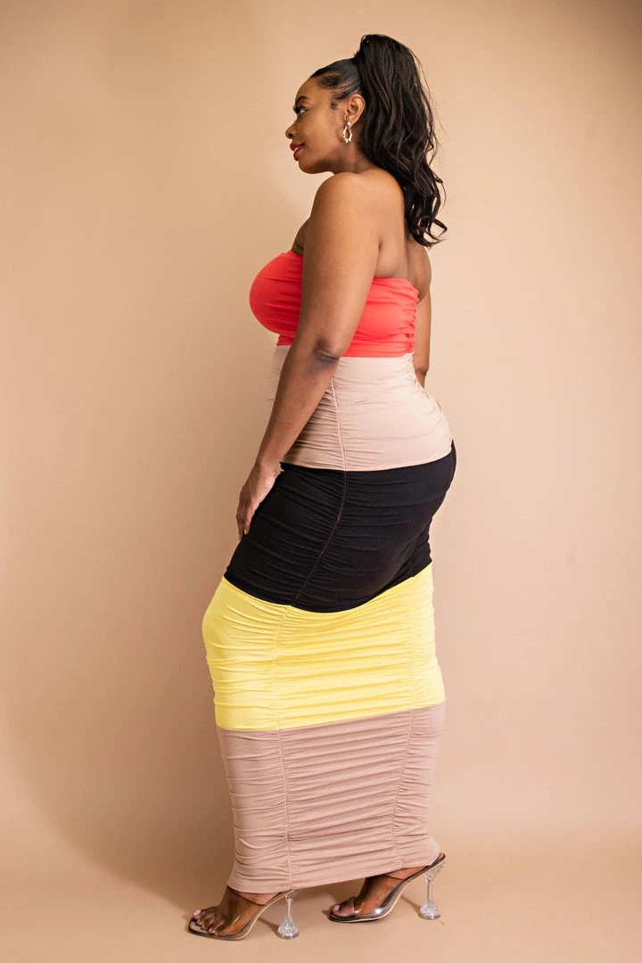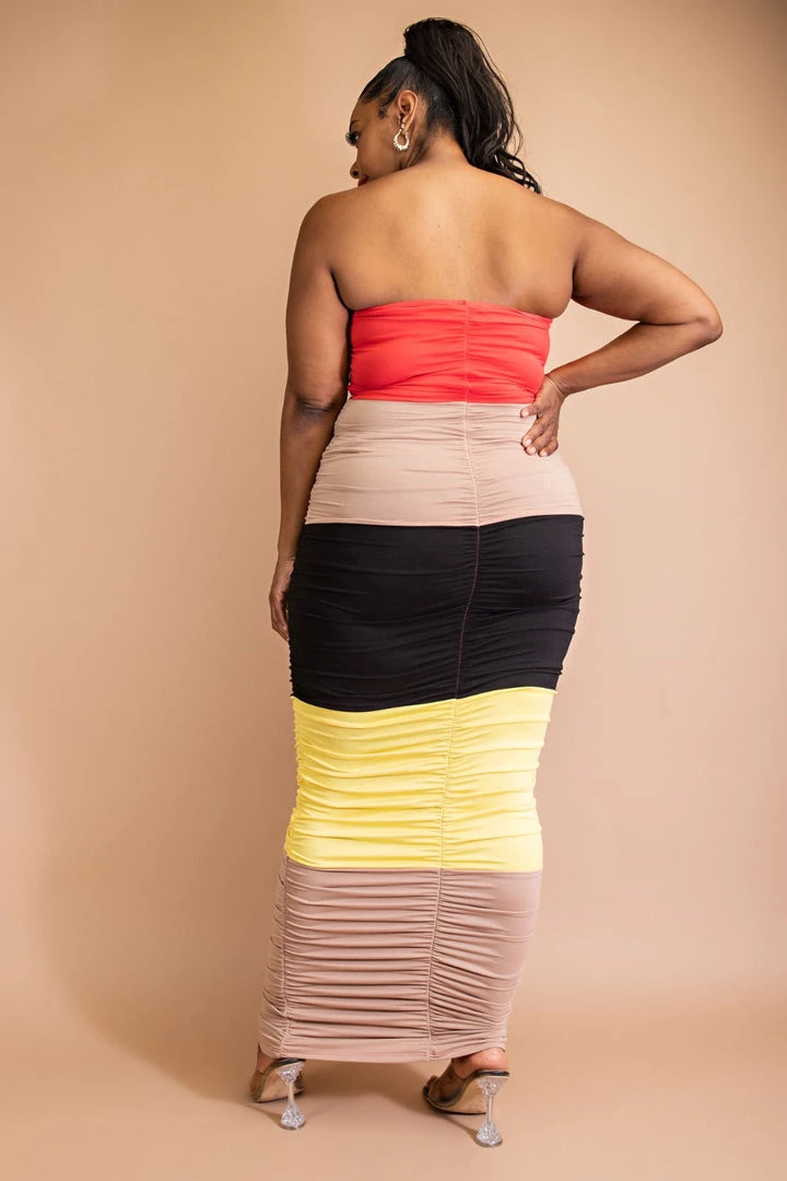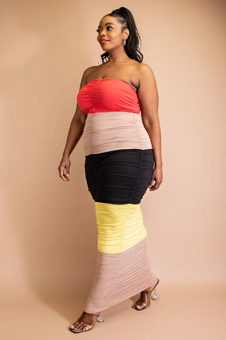 This plus size, tube dress features front ruched detailing for a curve hugging silhouette, off the shoulders with color blocking design.