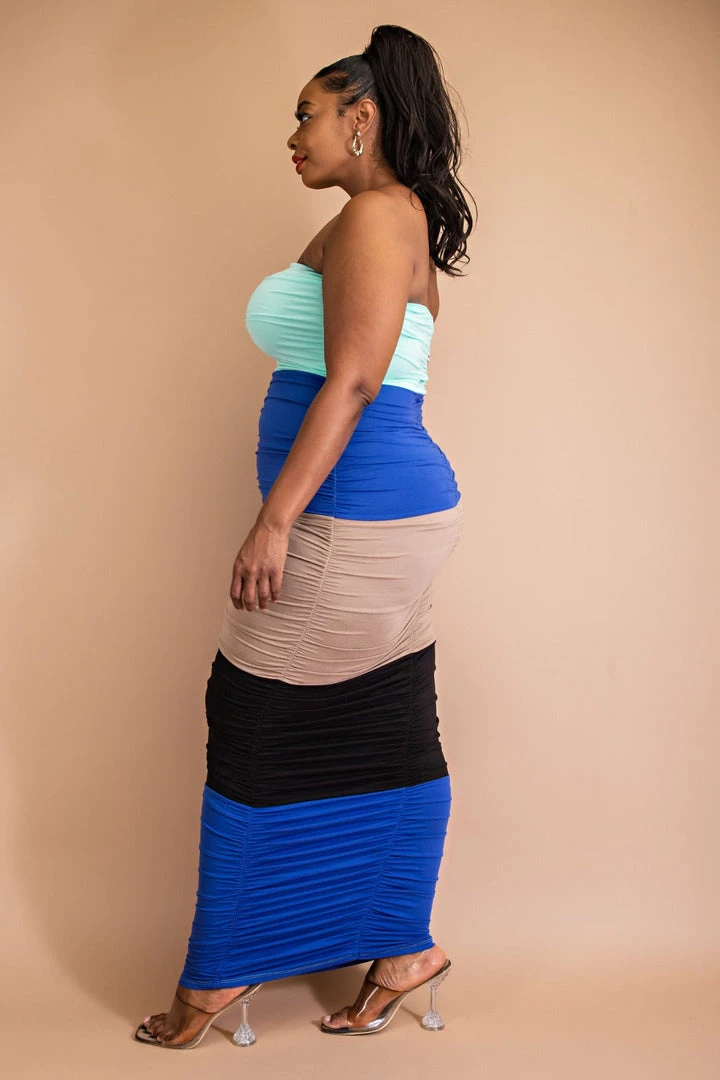 This plus size, tube dress features front ruched detailing for a curve hugging silhouette, off the shoulders with color blocking design.