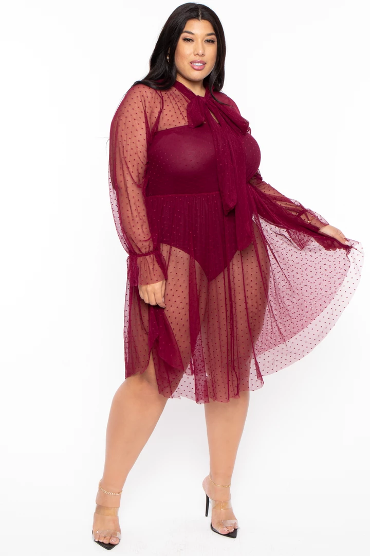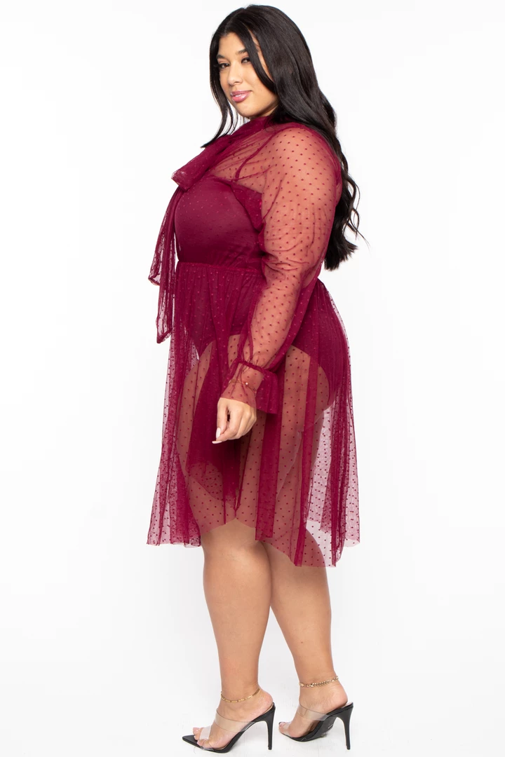 This plus size, stretch polka dot mesh dress features a V-neckline with self-tie detail, long sleeves with elastic wrist creating a ruffle detail an elastic waist, and flared hem