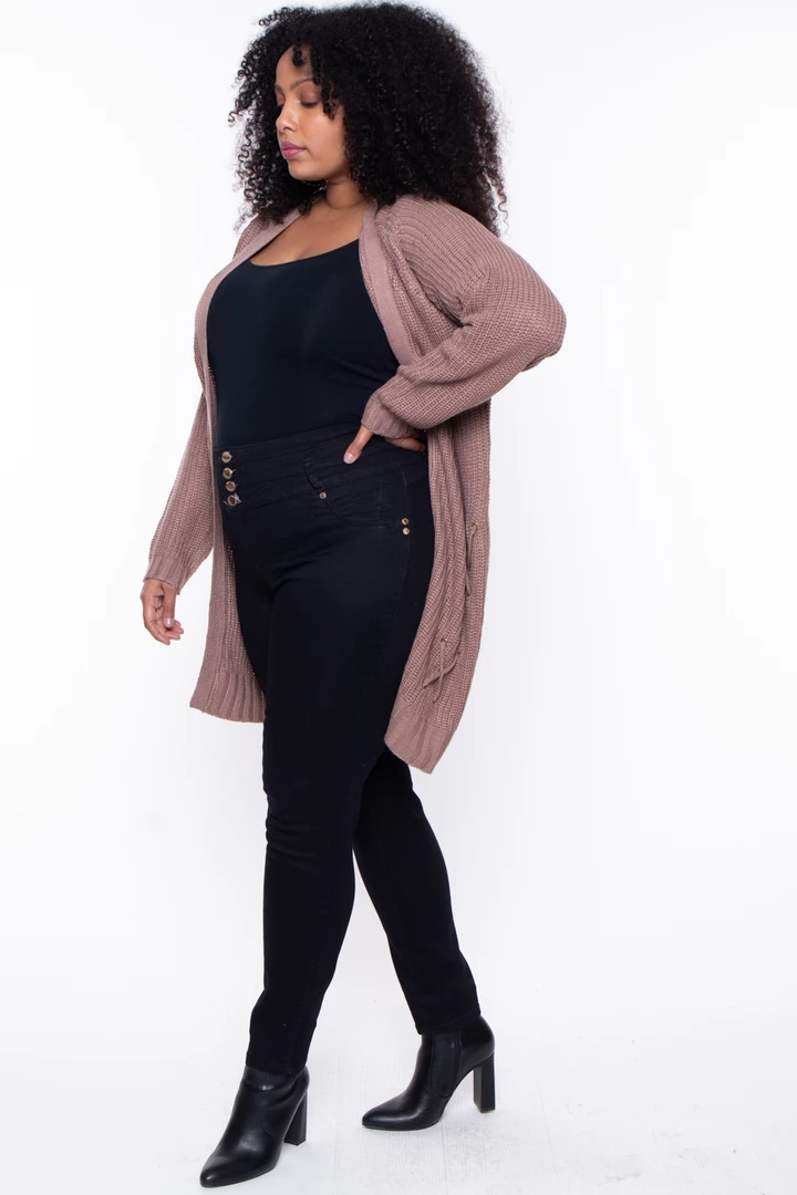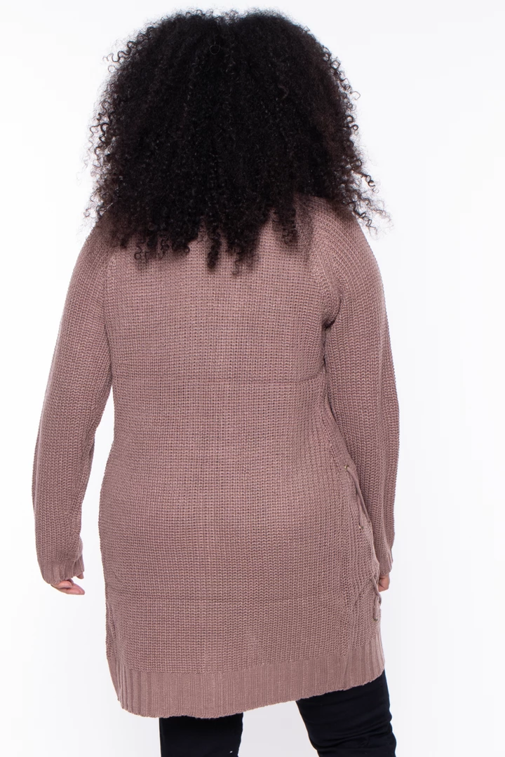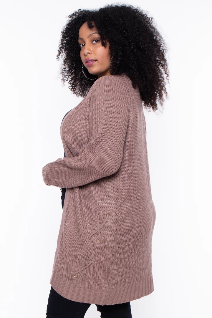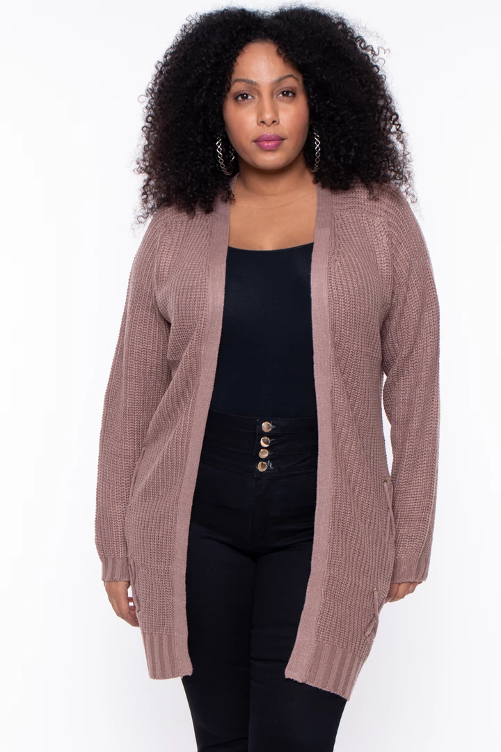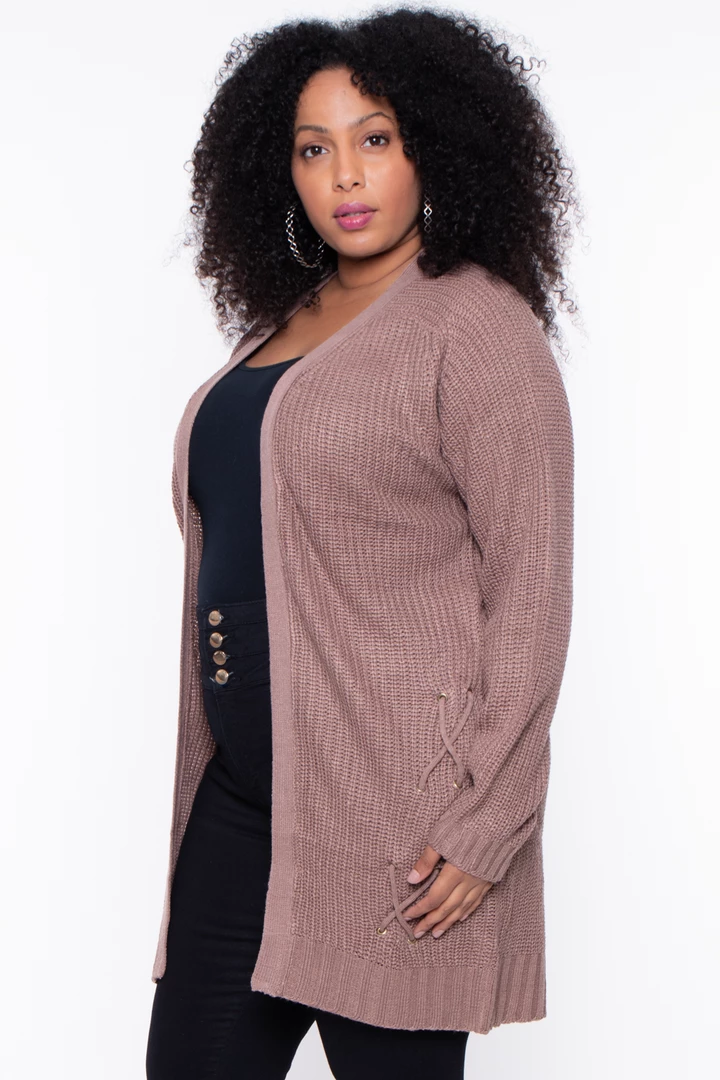 This plus size, knit cardigan featuring an open front with lace-up design, long sleeves, and ribbed trim