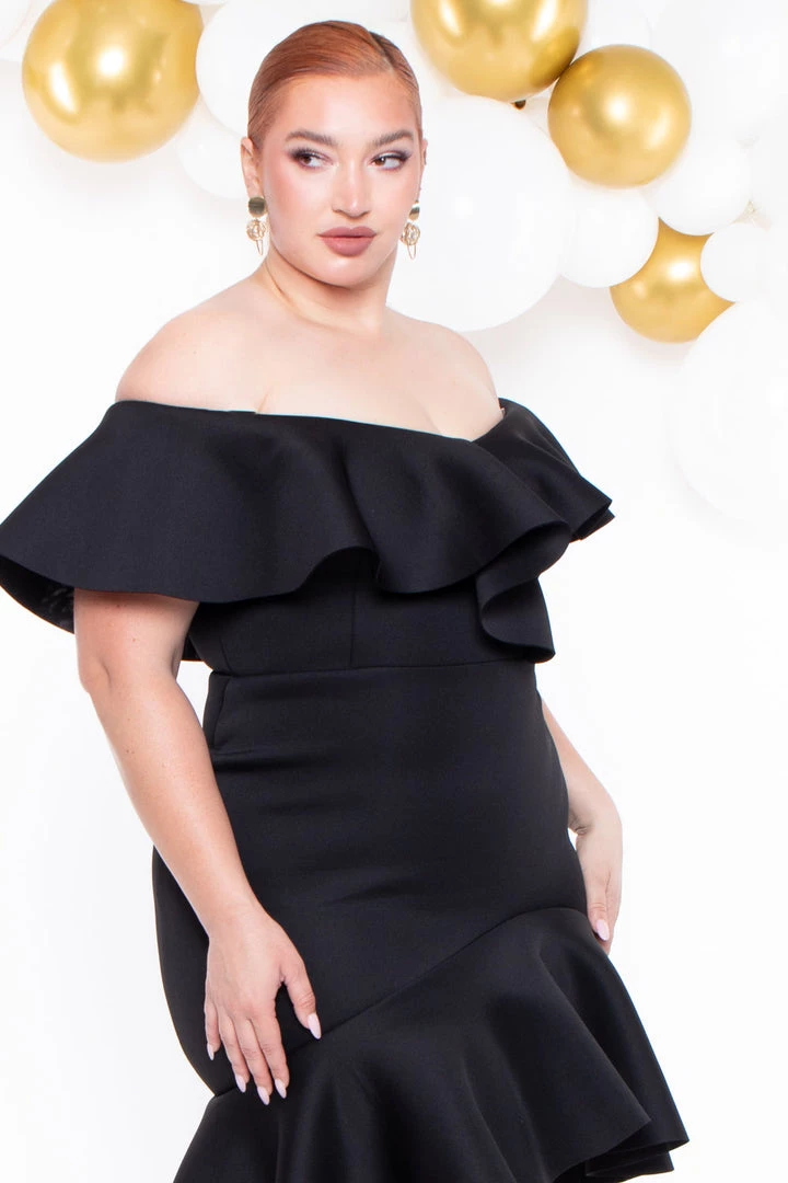 This plus size, dress is fun and flirty! Liesel features a beautiful off the shoulder ruffled neckline and hemline, plus comfortable material.
