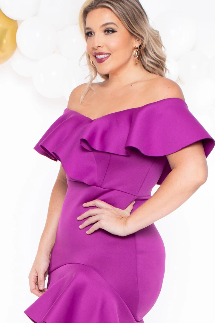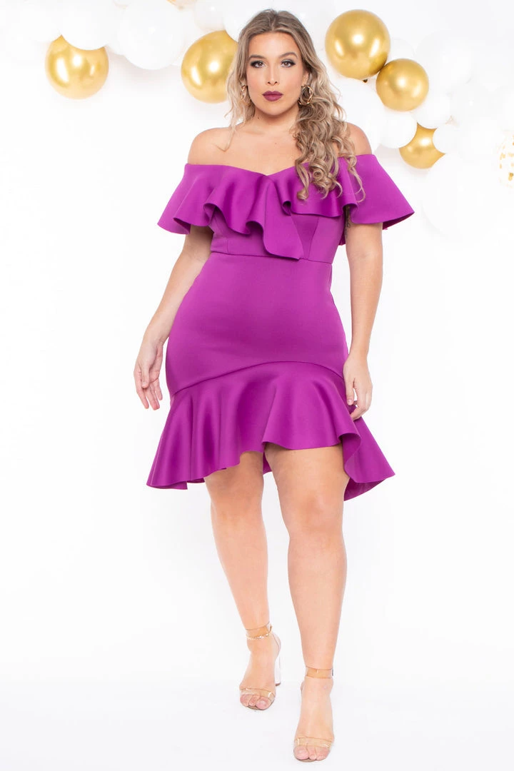 This plus size, dress is fun and flirty! Liesel features a beautiful off the shoulder ruffled neckline and hemline, plus comfortable material.