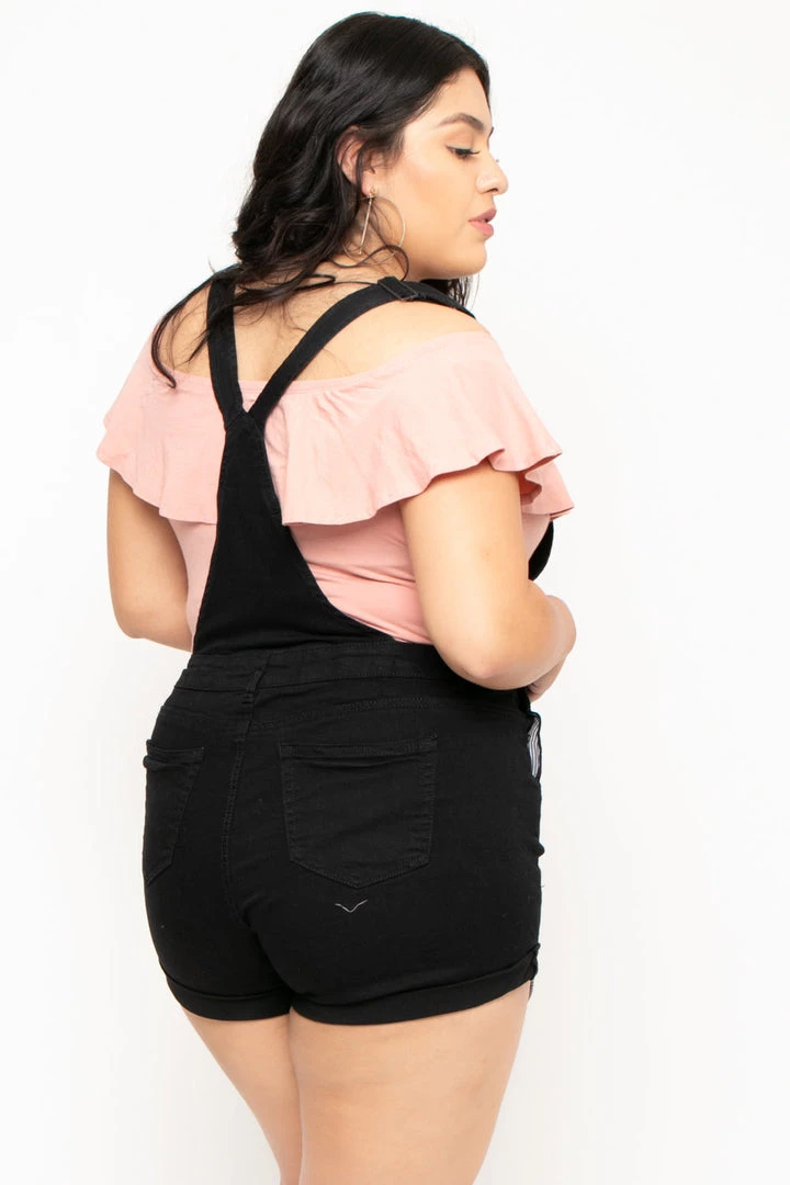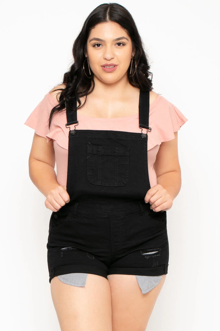 This plus size, woven overall short features adjustable straps at neck, a button flap chest pocket bib, a sleeveless cut, 5-pocket construction, adjustable button up at side waist for improved comfort, a light distressed effect, and a rolled up bottom hem.