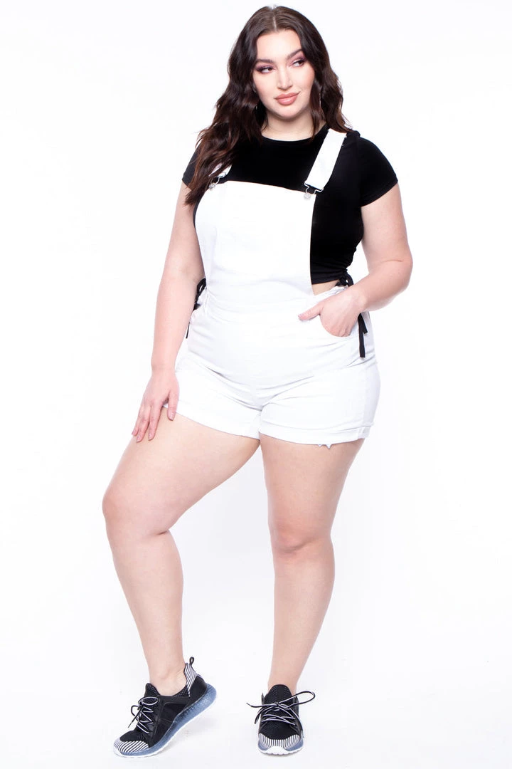 This plus size, woven overall short features adjustable straps at neck, a button flap chest pocket bib, a sleeveless cut, 5-pocket construction, adjustable button up at side waist for improved comfort, a light distressed effect, and a rolled up bottom hem.