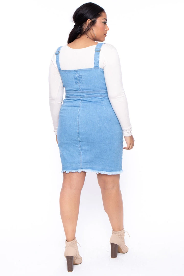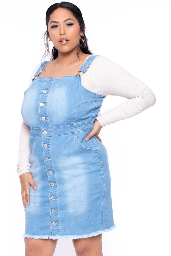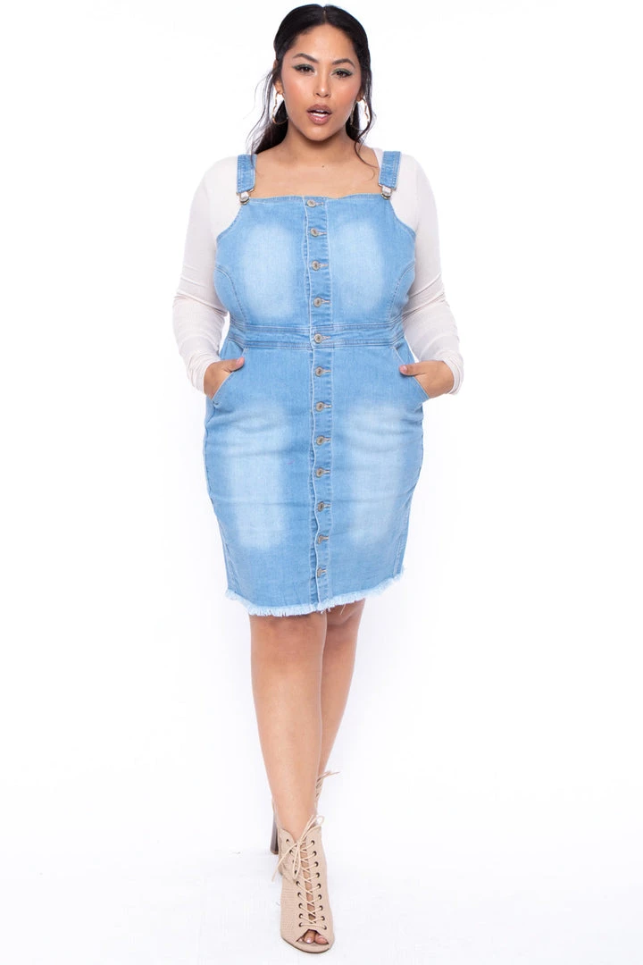 This plus size, denim overall dress features a button front closure, adjustable shoulder straps that clasp at the square neckline, burnished hardware, side pockets, and a raw bottom hemline.