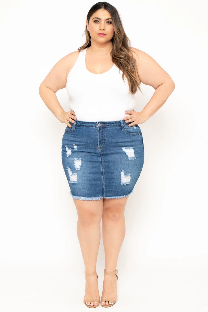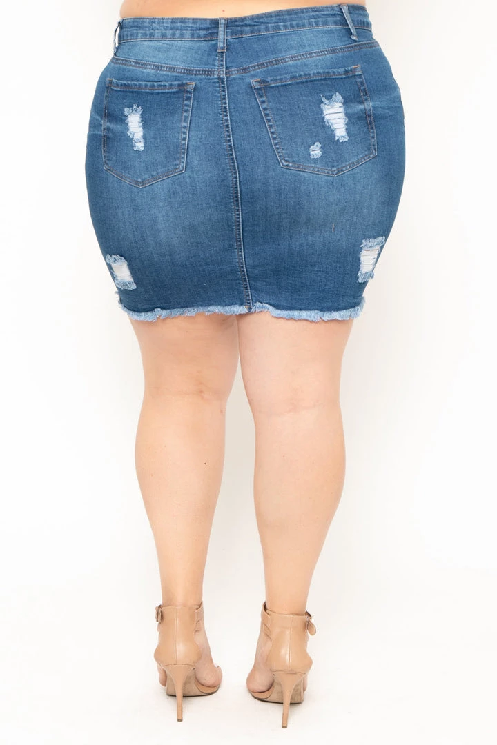 This plus size, stretch skirt features a five-pocket construction, whiskering, a zip fly button closure, distressed design throughout, and a frayed hem.