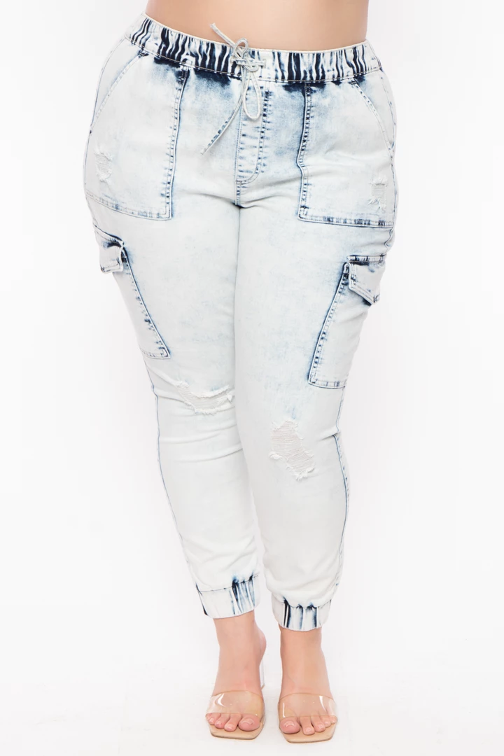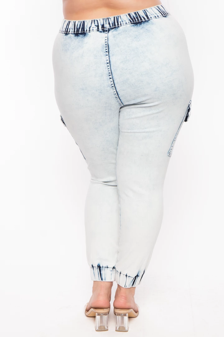 This plus size, stretch jogger style jean features a light acid wash, elastic waistband with drawstring. Cargo style pockets, elastic pants hemline, and skinny leg cut.