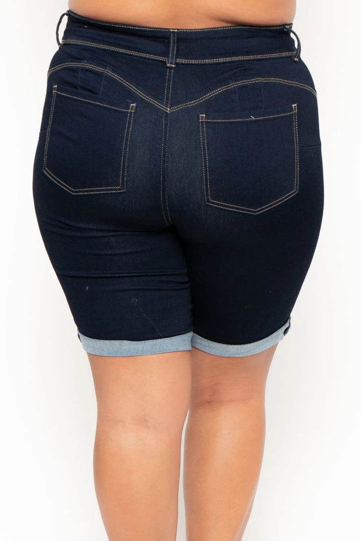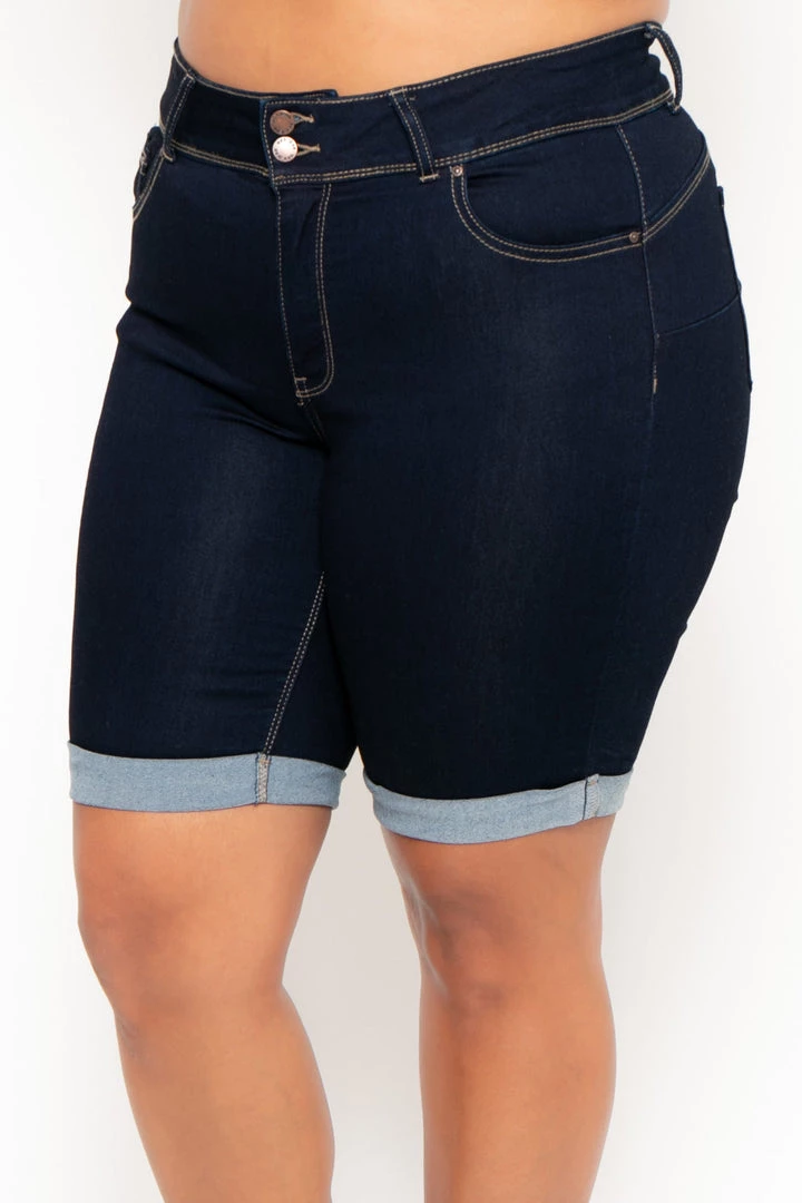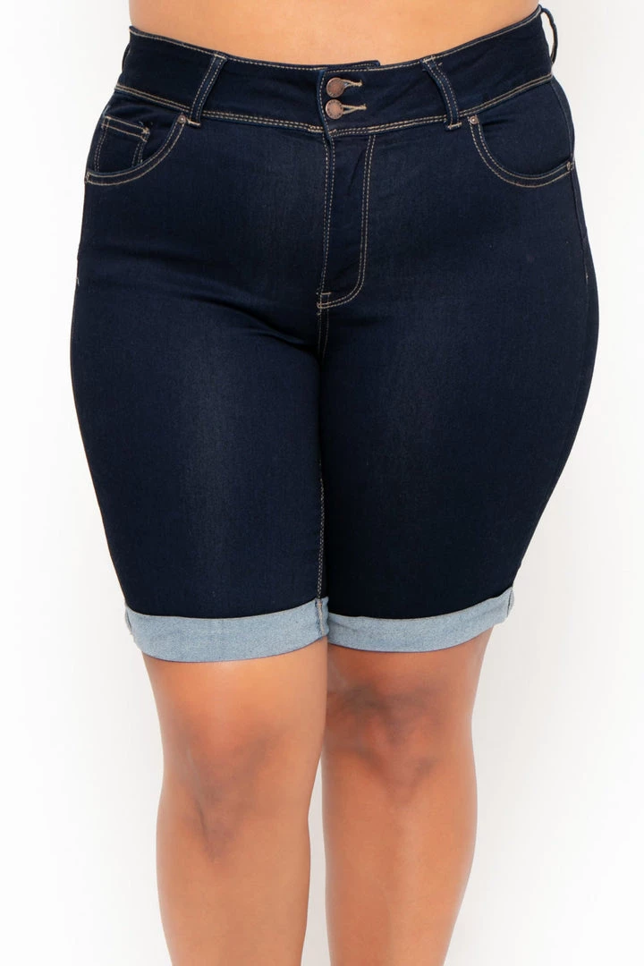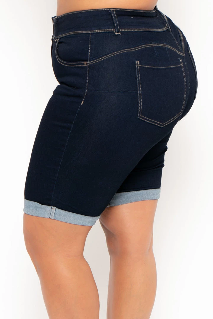 This plus size, stretchy jean short features a high waist, a zip fly with 2-button closure at waist, a five pocket construction detail, a sculpted silhouette, contoured curves, comfy, cozy feel, rounded butt, and a rolled up hemline.