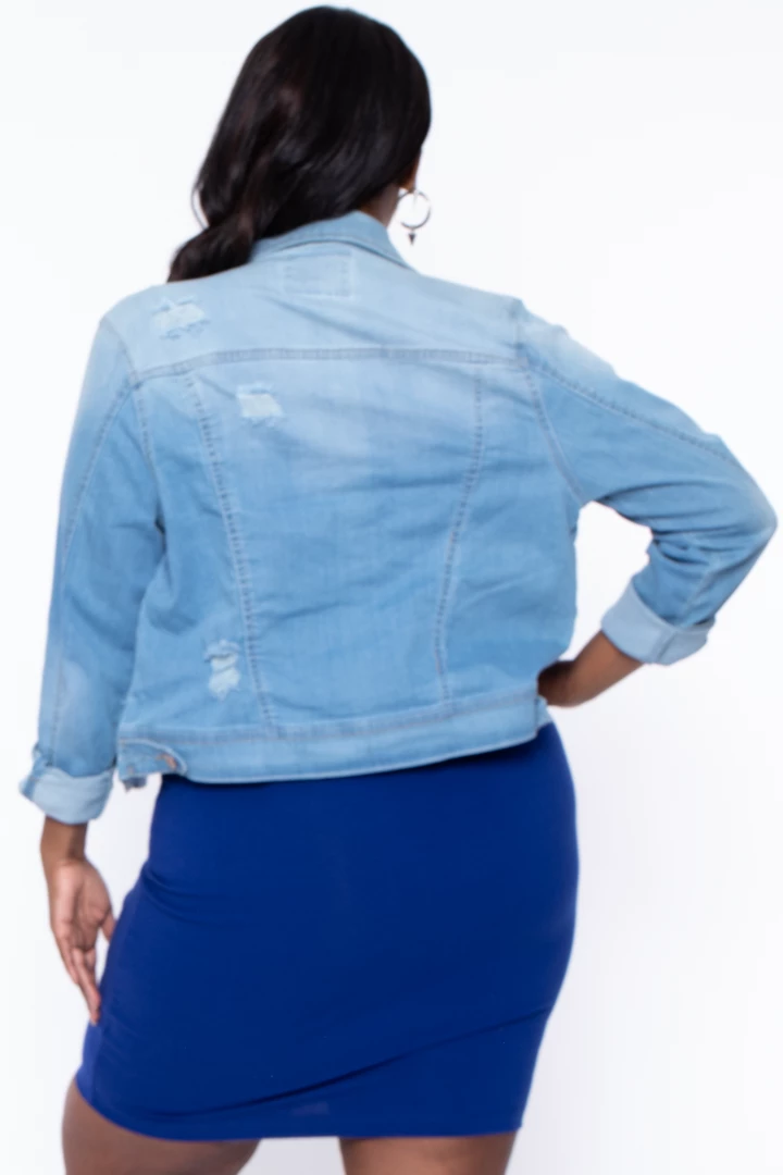 This plus size, light weight stretch jacket features a cropped style line an all-over light destroyed design, a basic collar, a button-down placket, flap chest pockets, long sleeves with buttoned cuffs, and button epaulets at back hemline.