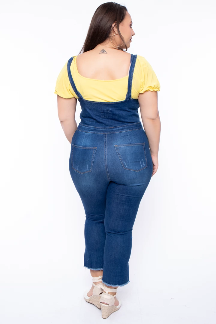 This plus size, denim overalls feature adjustable shoulder straps, a functional button front bib, five-pocket construction, and a cropped flare leg