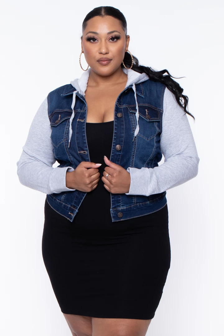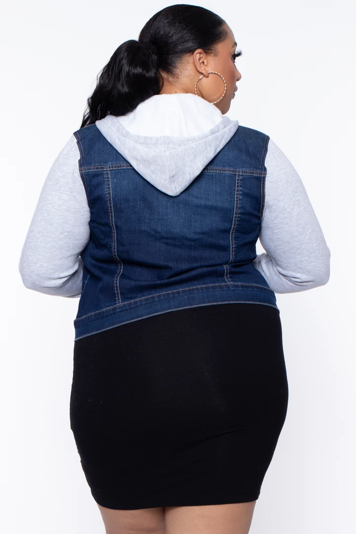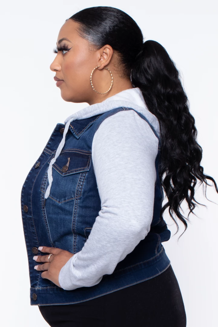 This plus size, heavyweight, woven denim hoodie jacket features a denim collar with an over top sweater hoodie a button-down placket, flap chest pockets, side pockets, long sweater sleeves.