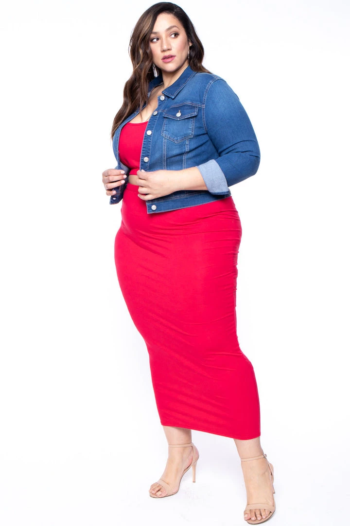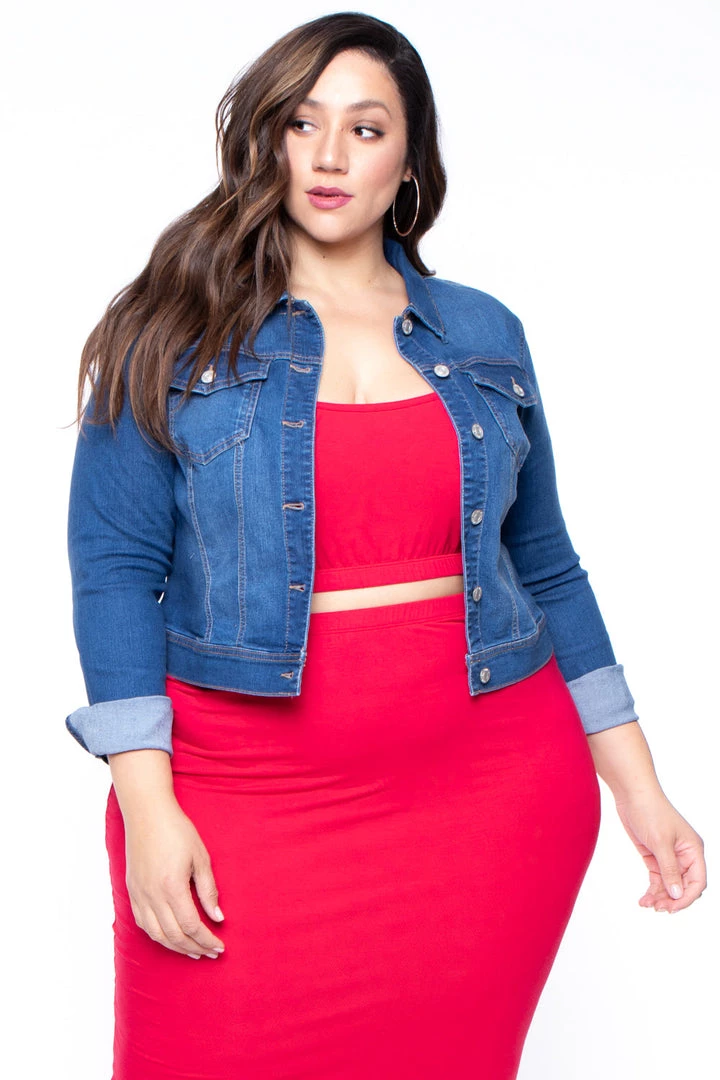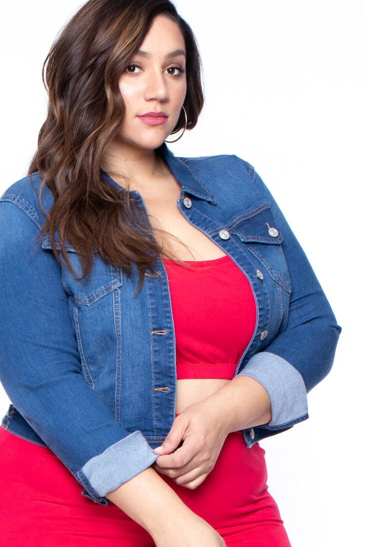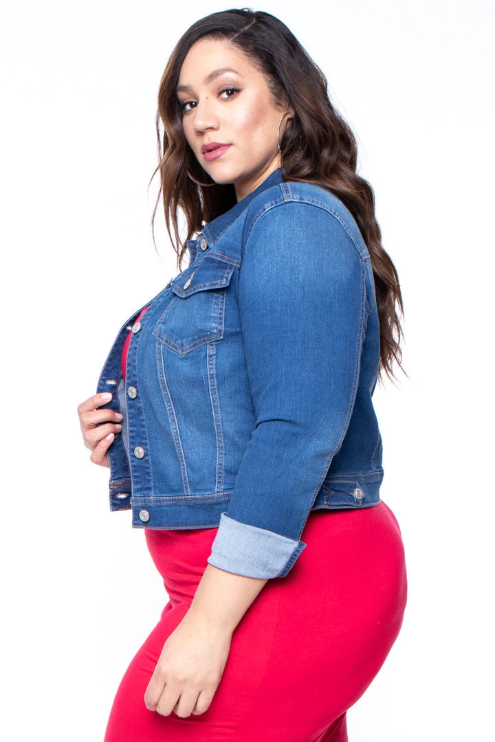 This plus size, stretch denim jacket features a basic collar, a button down placket, long sleeves with button cuffs, twin chest flap pockets, and a stone wash effect.