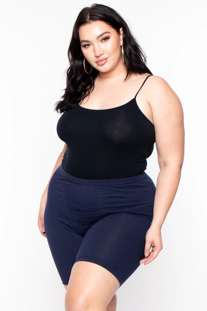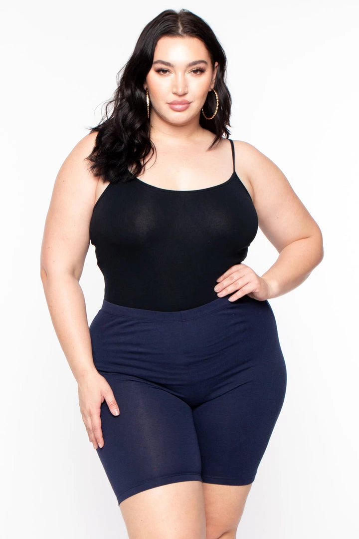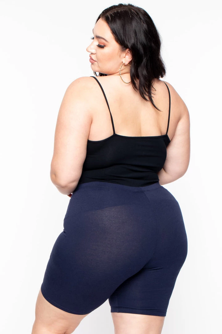 This plus size, stretch knit biker short features an elasticized high waistband, stretch cotton-blend, an elasticized waist, a pull on style, and a relaxed fit.