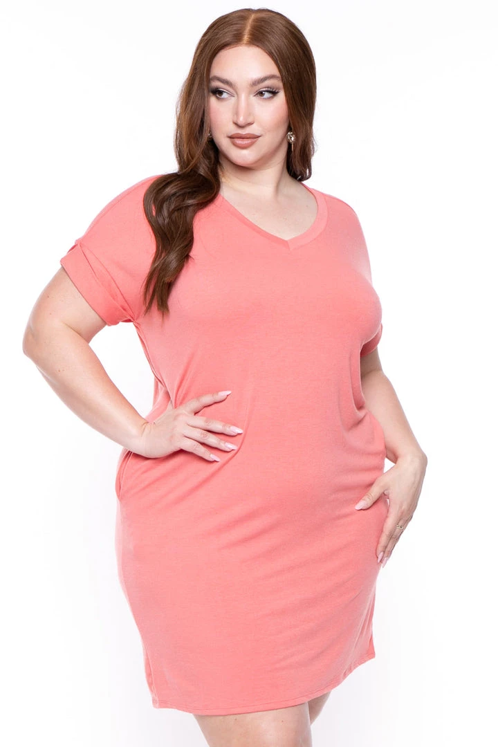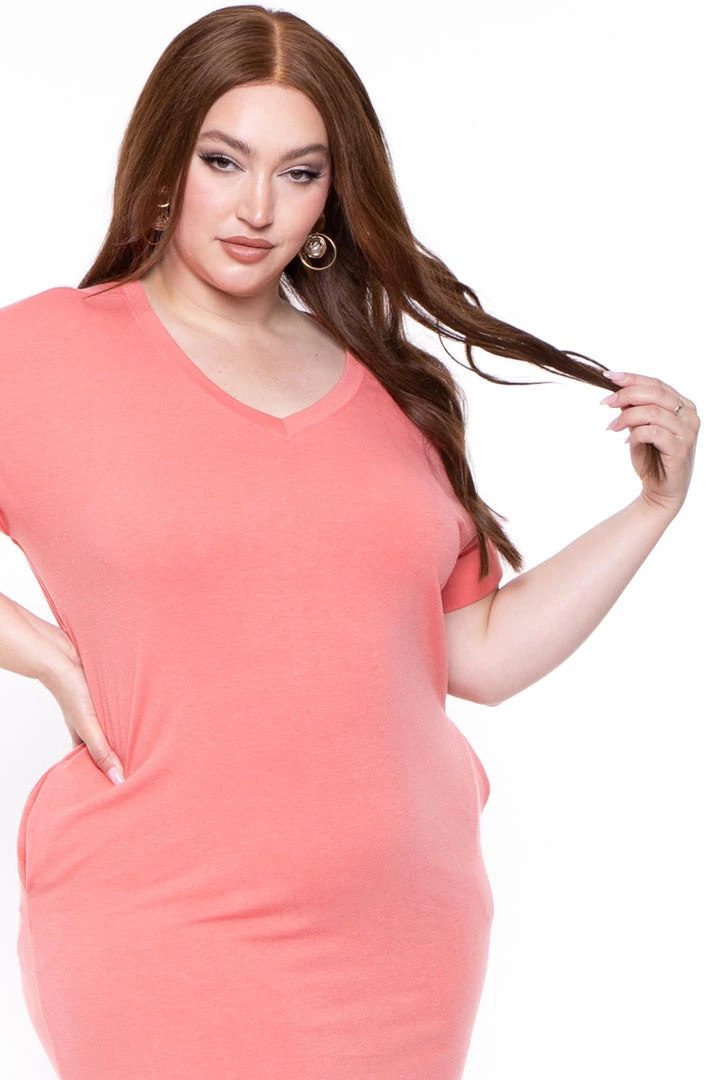 This plus size, stretch knit T-shirt dress features a V-neckline, dropped shoulders, short rolled sleeves, side-seam pockets, and a relaxed fit