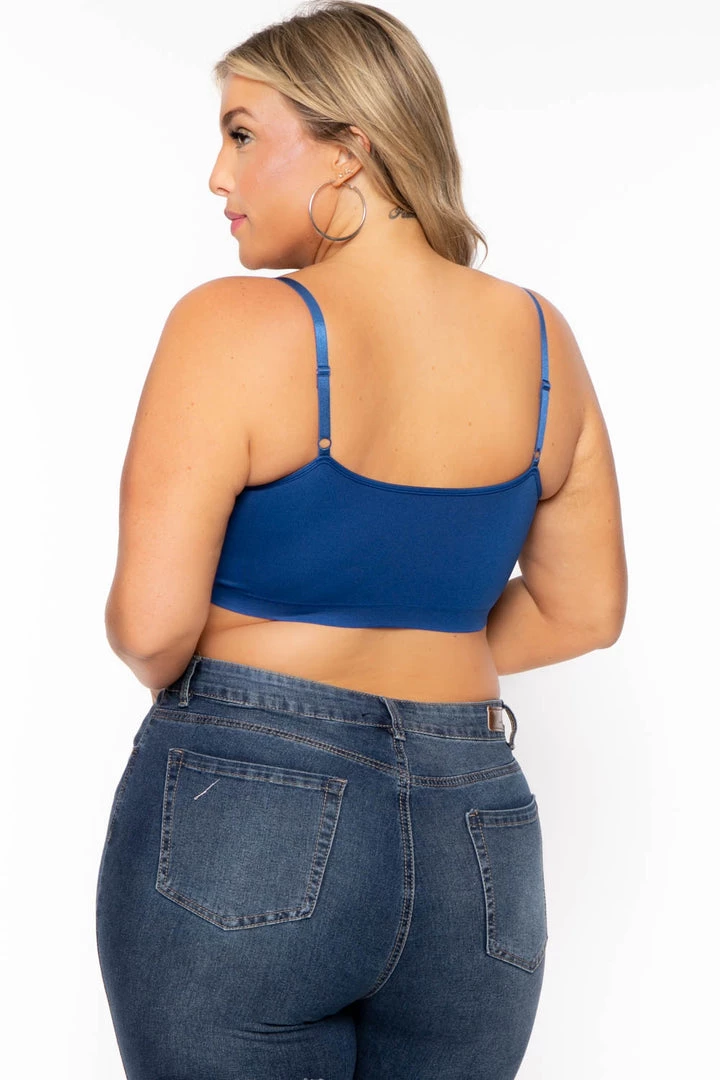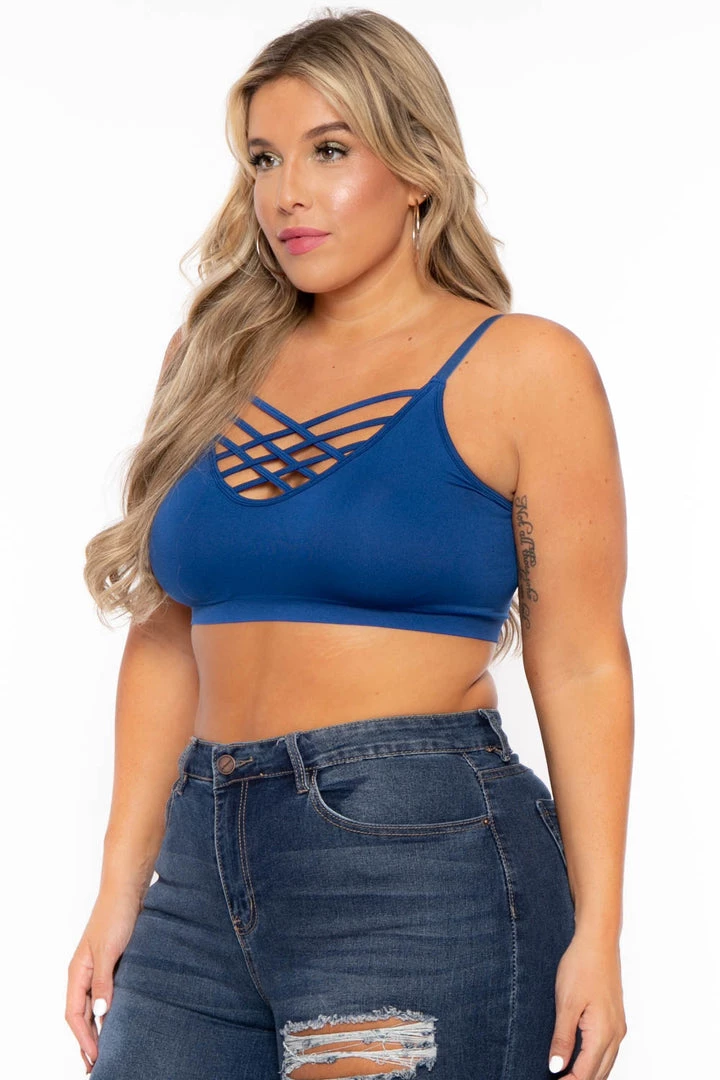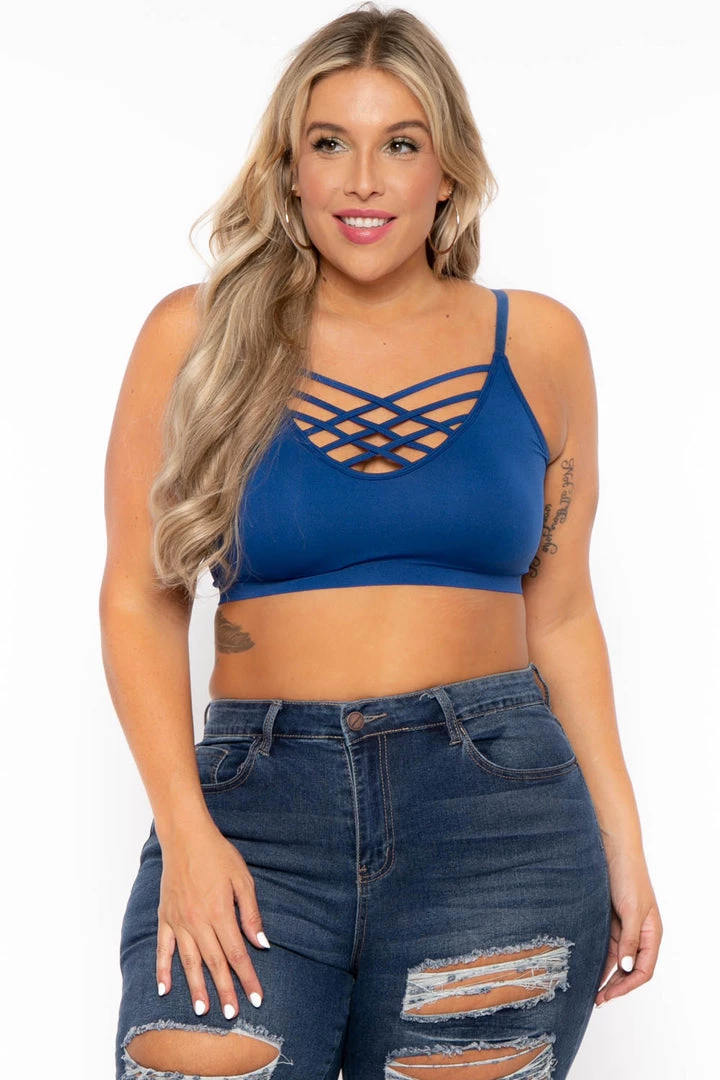 This plus size, stretch knit bralette features a scoop neckline with a X-front caged cutout design, adjustable cami straps, and molded cups for support.
