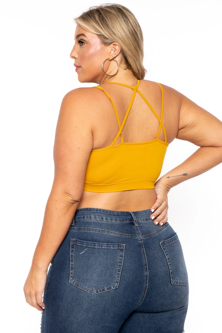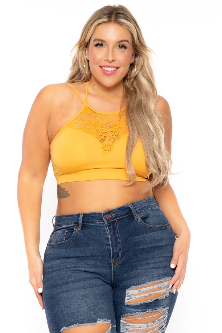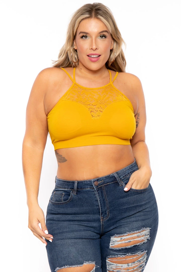 This plus size, stretch knit bralette features a halter neckline with a lace-trim inset, cami straps that cross in back, and molded cups for support.