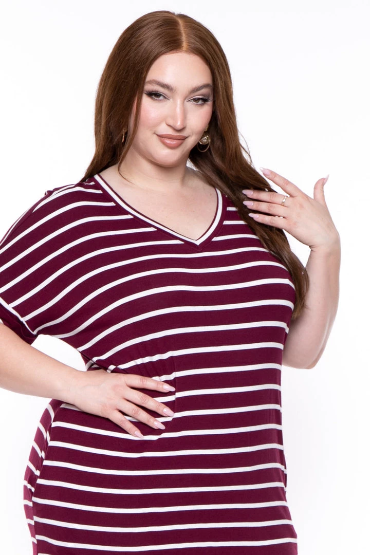 This plus size, stretch knit T-shirt dress features an allover stripe pattern, V-neckline, dropped shoulders, short rolled sleeves, side-seam pockets, and a relaxed fit.