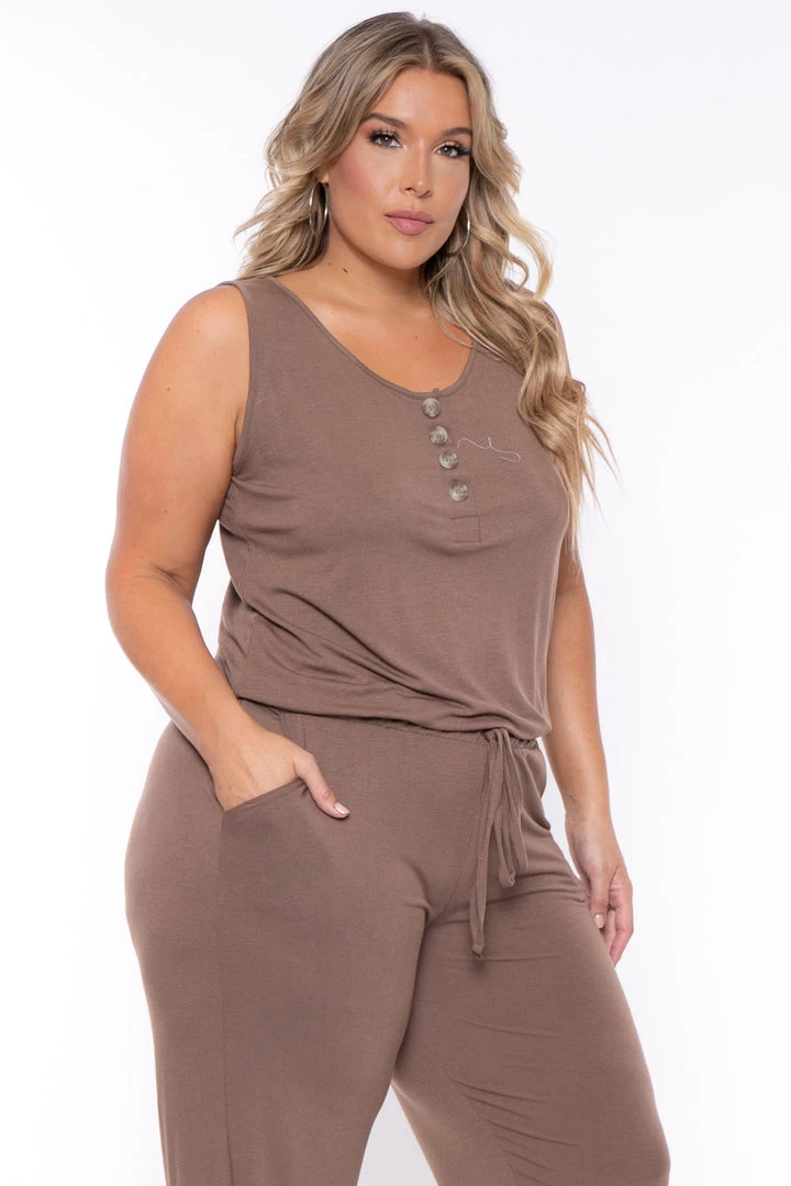 Zenana Party Jumpsuilts Plus Size Zelda Button Up Lounge Jumpsuit – Mocha