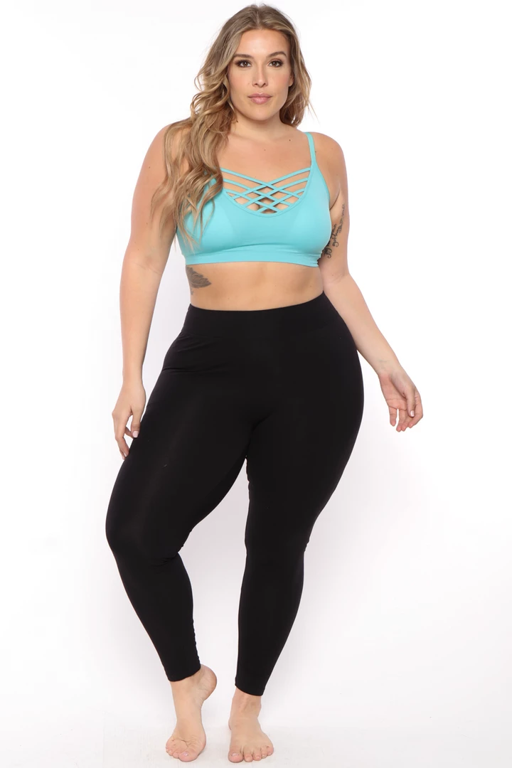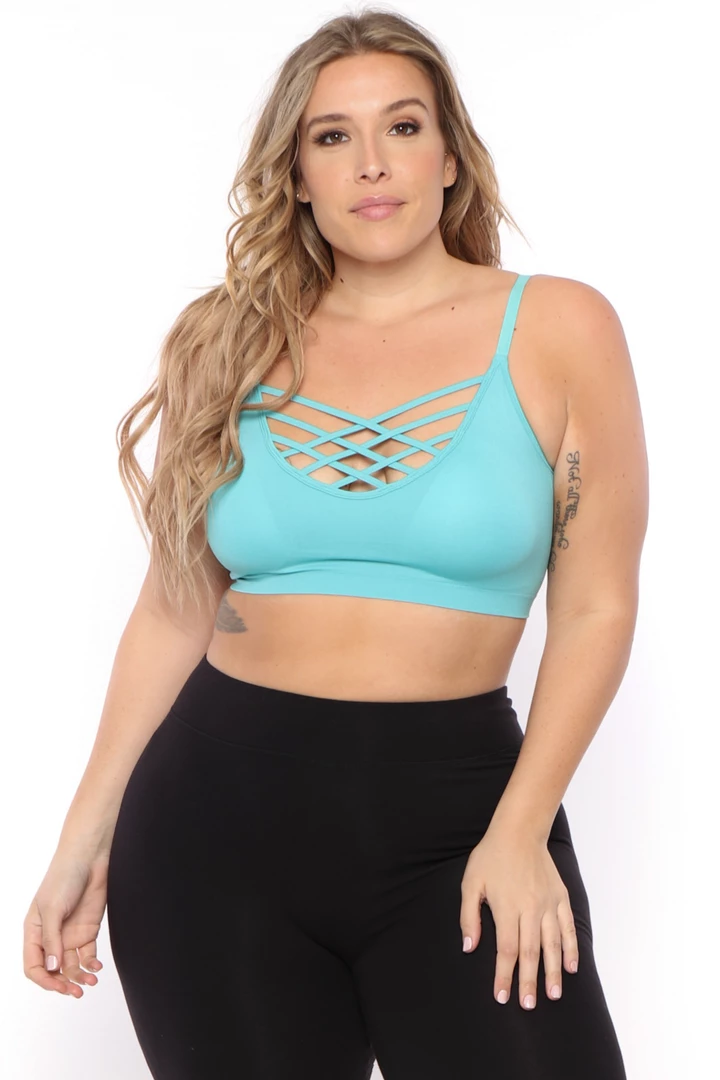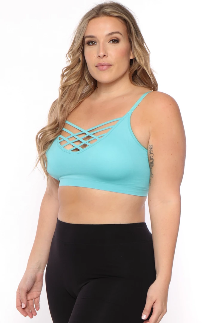 This plus size, stretch knit bralette features a scoop neckline with a X-front caged cutout design, adjustable cami straps, and molded cups for support.