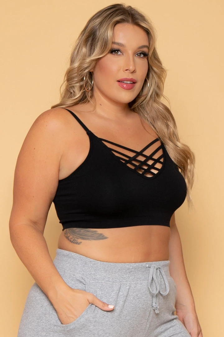 This plus size, stretch knit bralette features a scoop neckline with a X-front caged cutout design, adjustable cami straps, and molded cups for support.