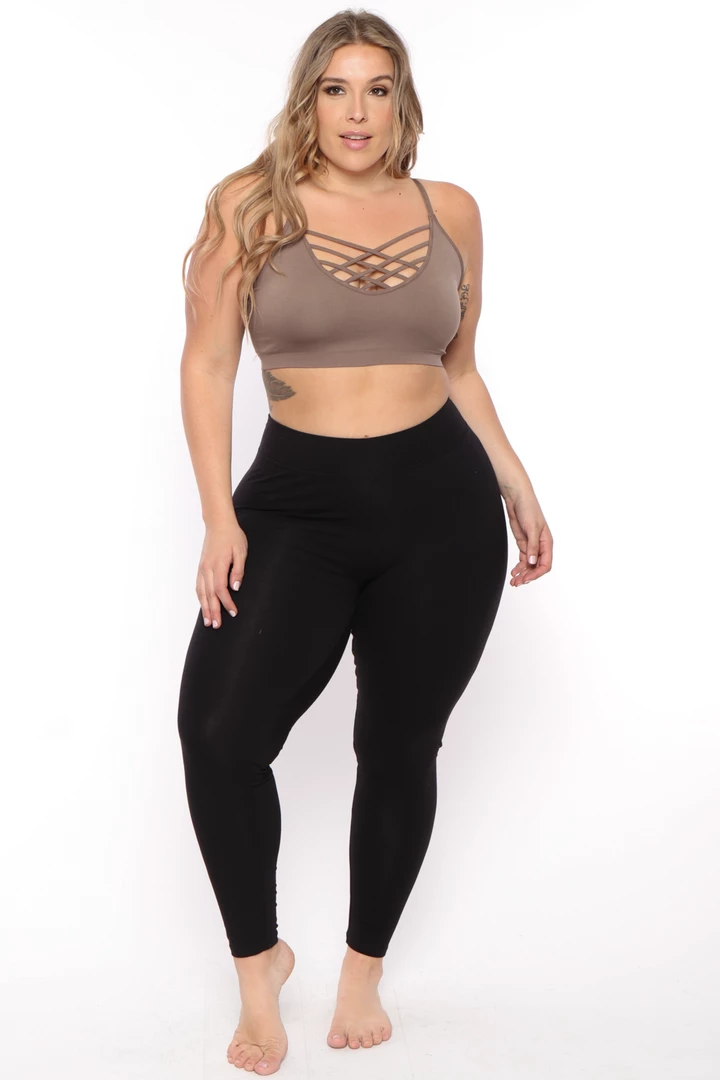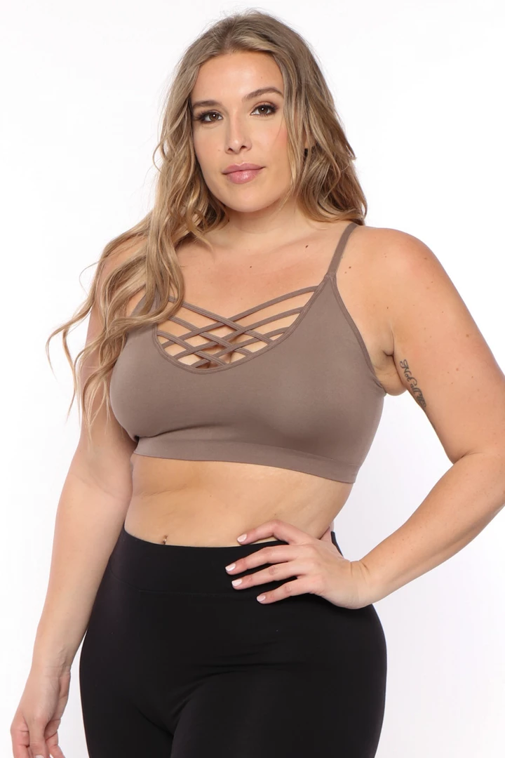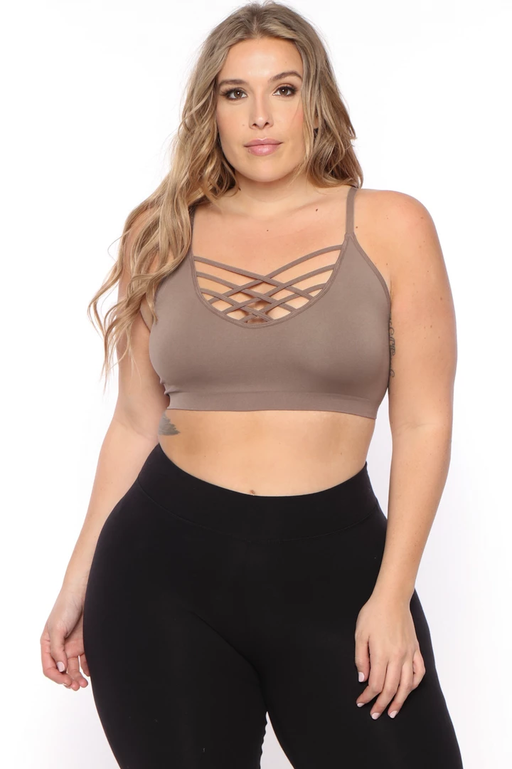 This plus size, stretch knit bralette features a scoop neckline with a X-front caged cutout design, adjustable cami straps, and molded cups for support.