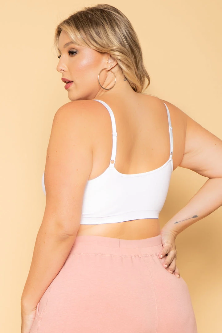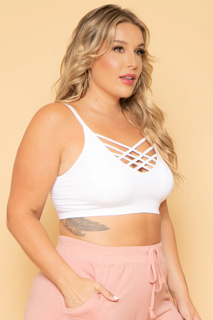 This plus size, stretch knit bralette features a scoop neckline with a X-front caged cutout design, adjustable cami straps, and molded cups for support.