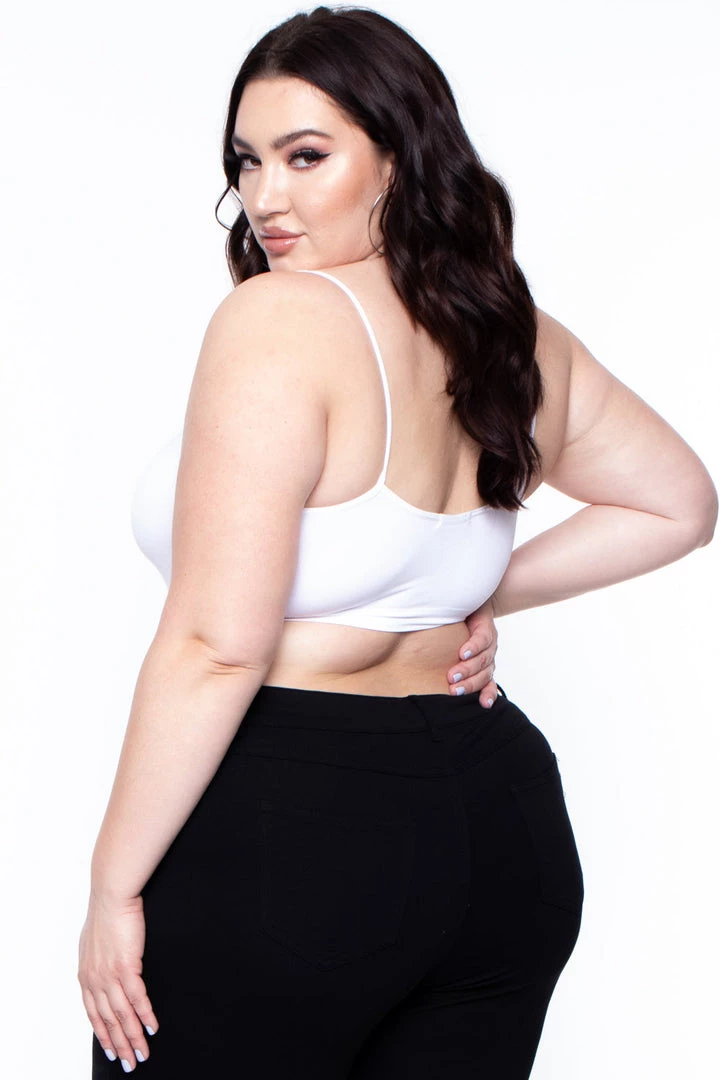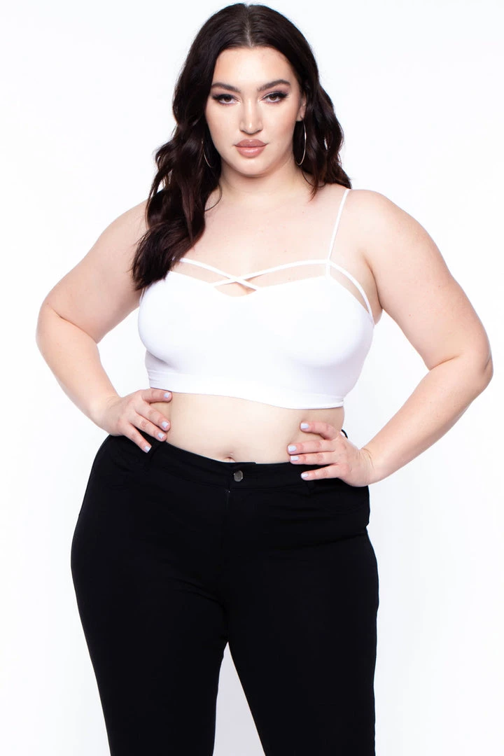 This plus size knit bralette features a V-neckline with a cutout design and cami straps.