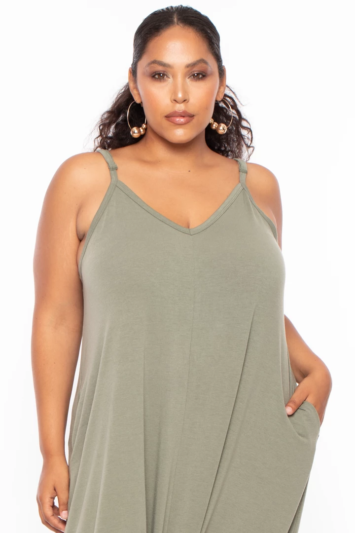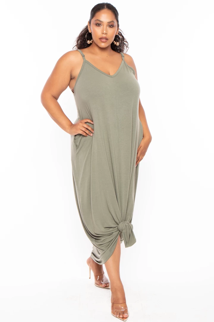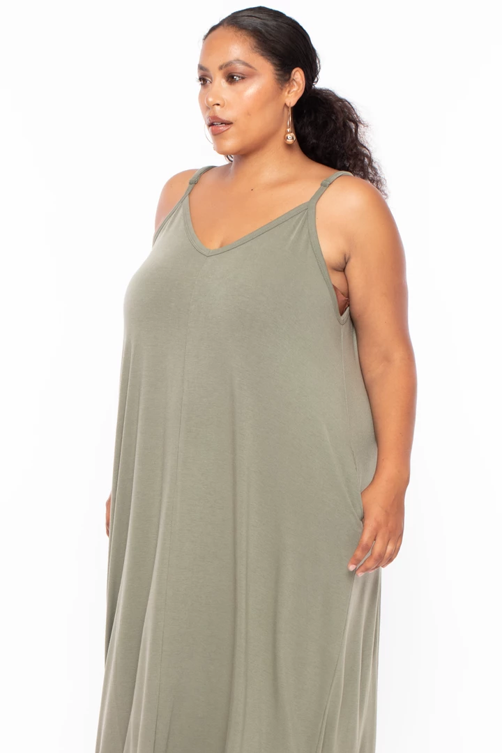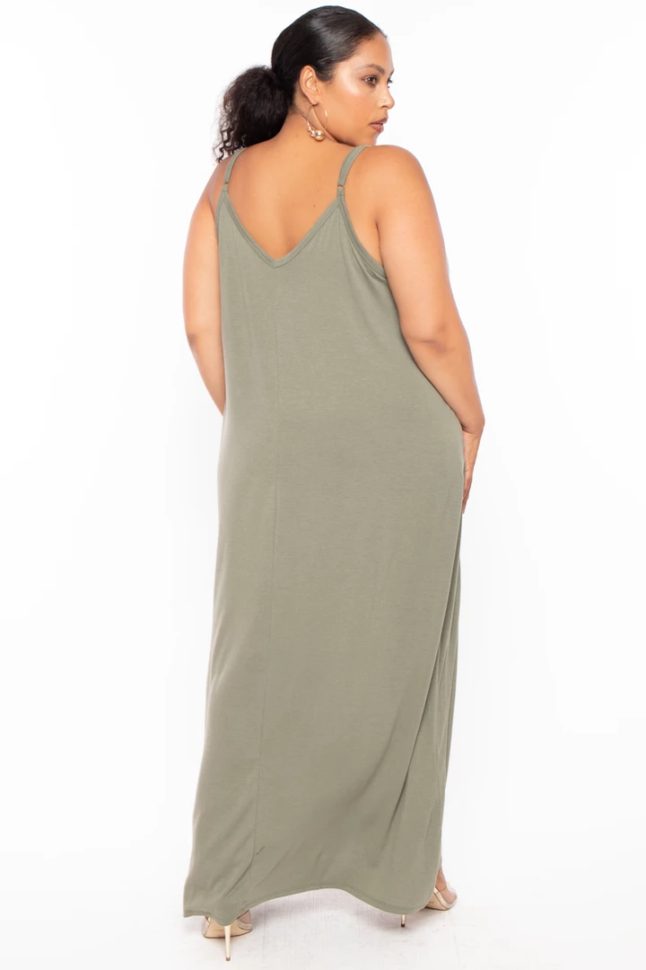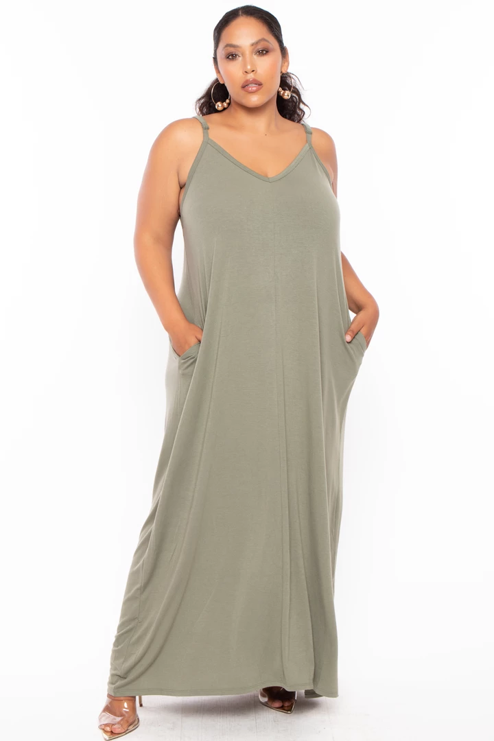 This plus size, stretch knit maxi T-shirt dress features V-neckline, adjustable cami straps, side-seam pockets, and a relaxed fit