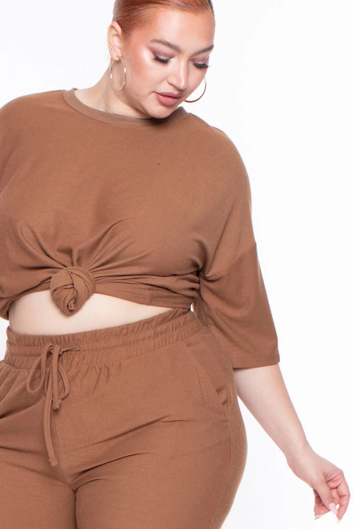 This plus size, lounge set is casual and effortless. Dee features lightweight material, crew neck, short sleeves and the pants have an elastic waistband with adjustable drawstrings, and pockets.