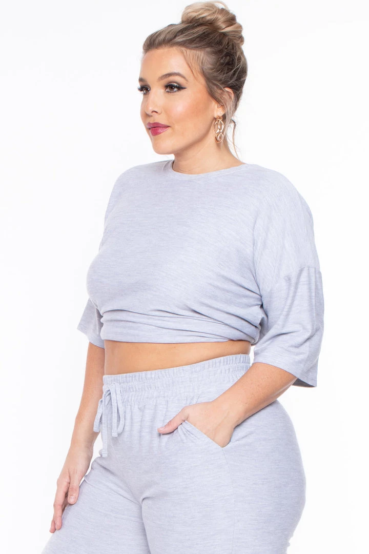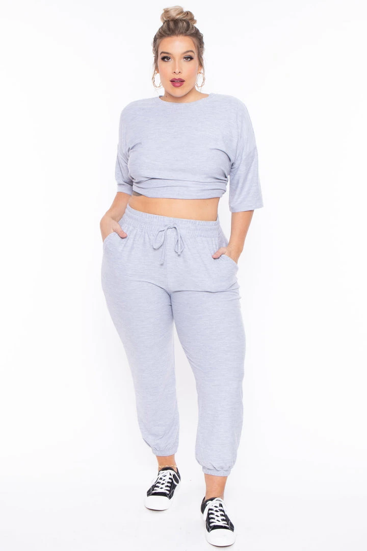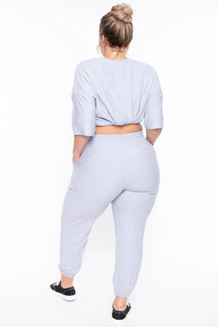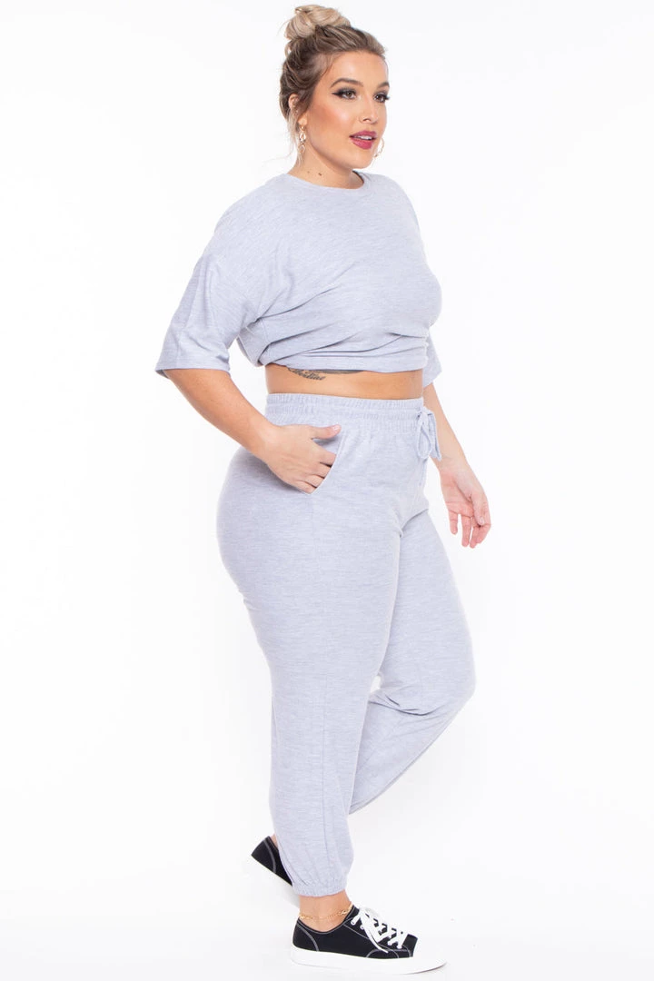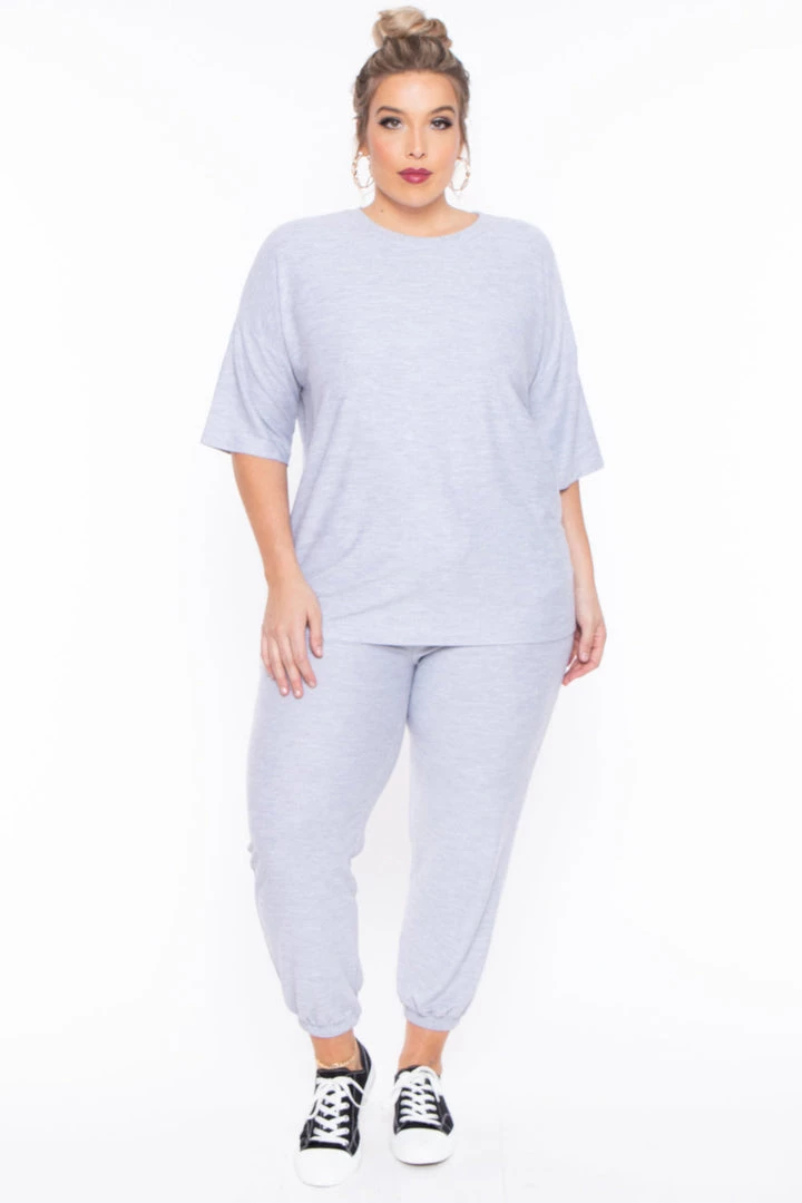 This plus size, lounge set is casual and effortless. Dee features lightweight material, crew neck, short sleeves and the pants have an elastic waistband with adjustable drawstrings, and pockets.