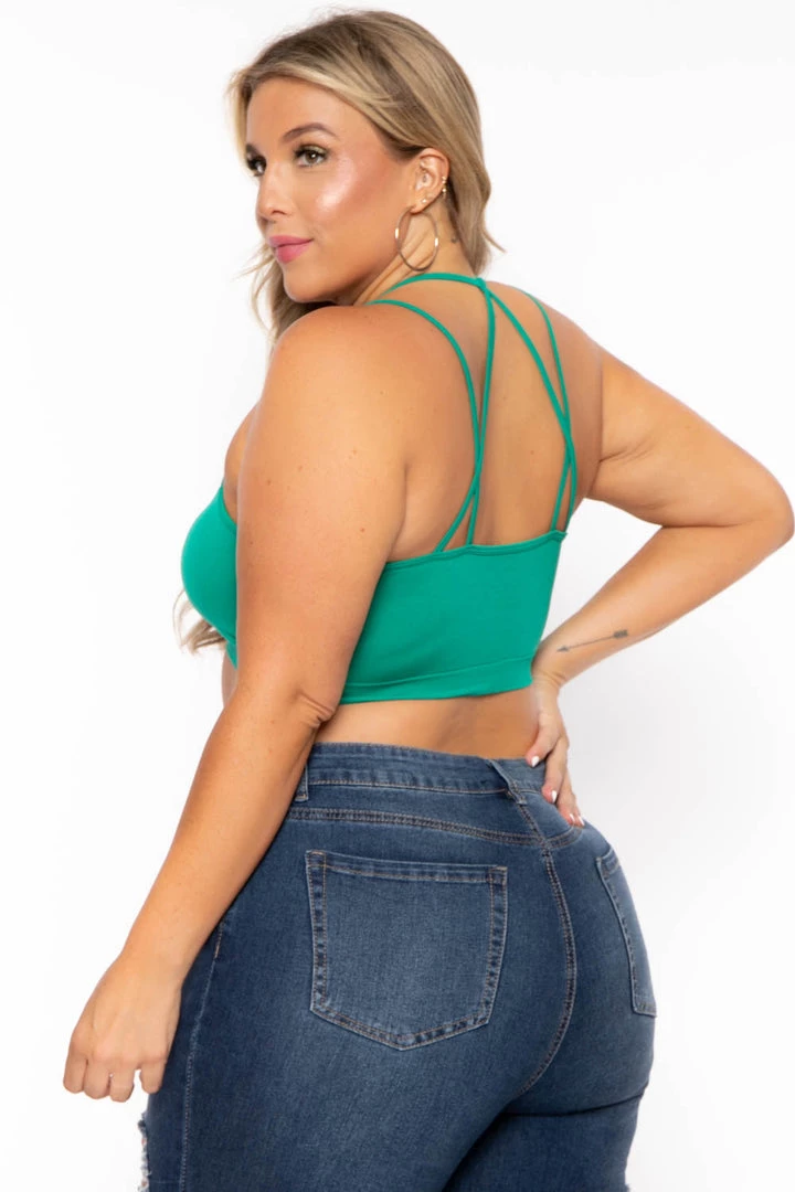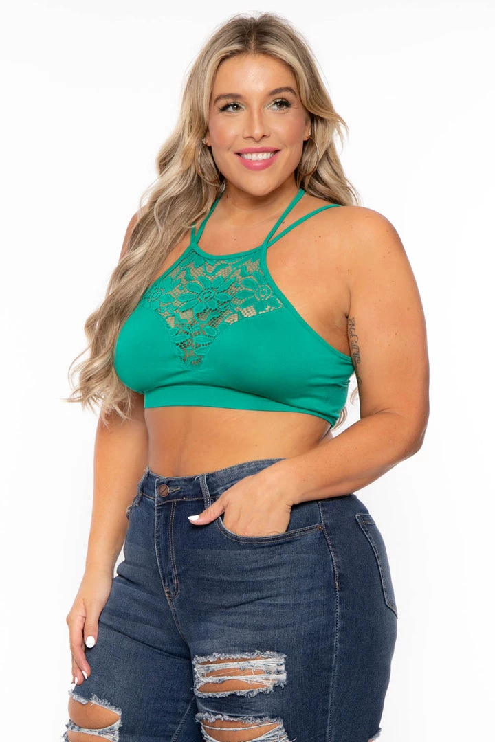 This plus size, stretch knit bralette features a halter neckline with a lace-trim inset, cami straps that cross in back, and molded cups for support.