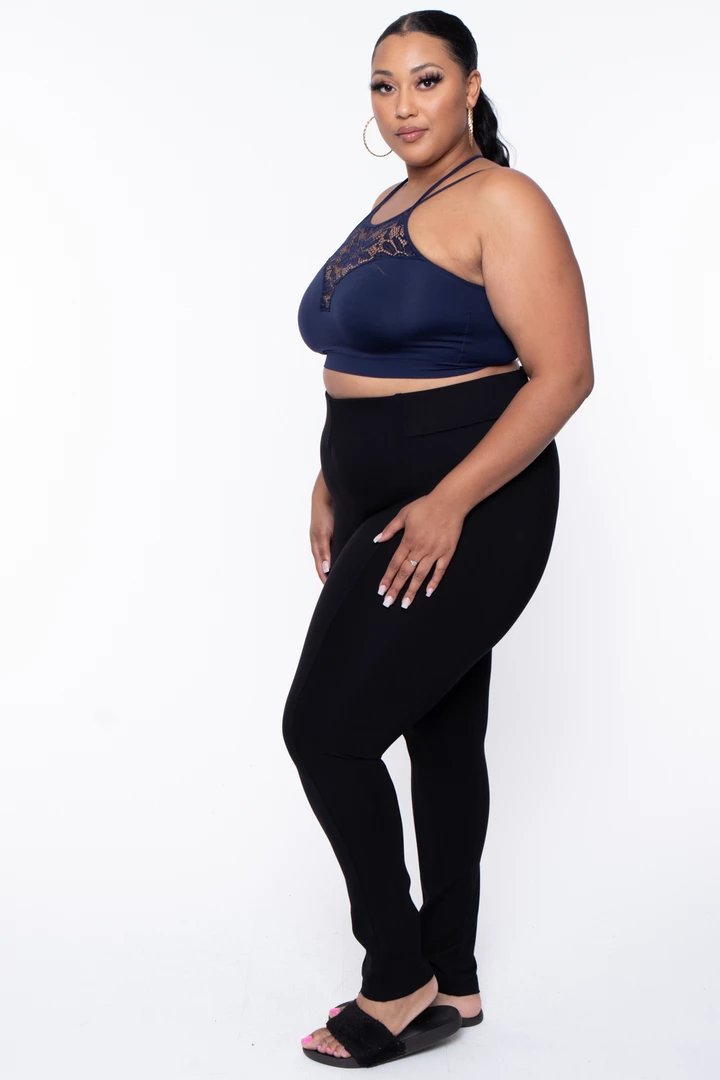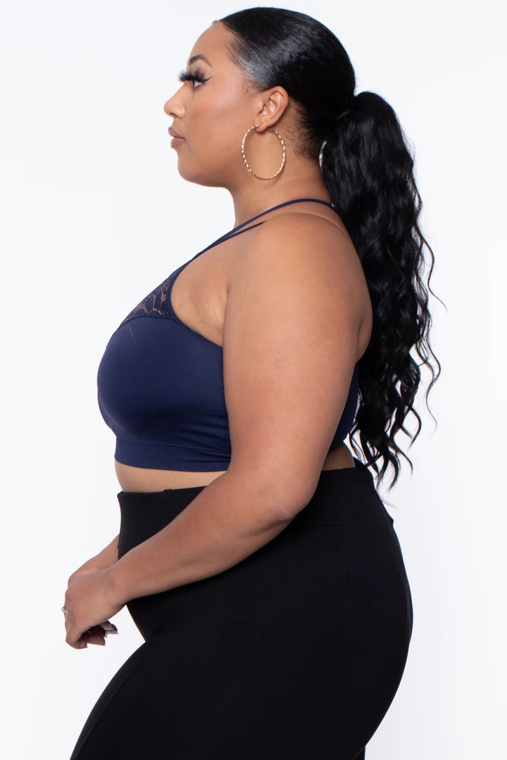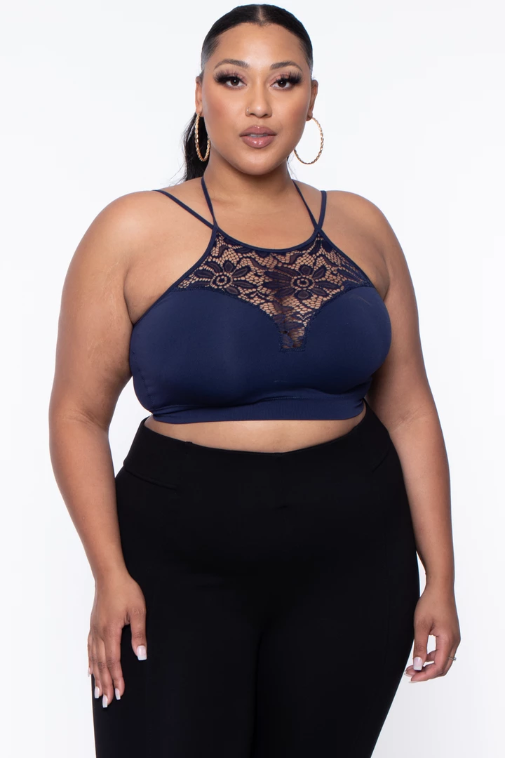 This plus size, stretch knit bralette features a halter neckline with a lace-trim inset, cami straps that cross in back, and molded cups for support.