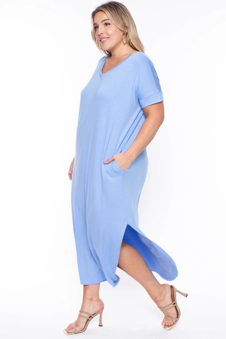 This plus size, stretch knit maxi T-shirt dress features a V-neckline, dropped shoulders, short sleeves, a curved hem with a side slit, and side-seam pockets