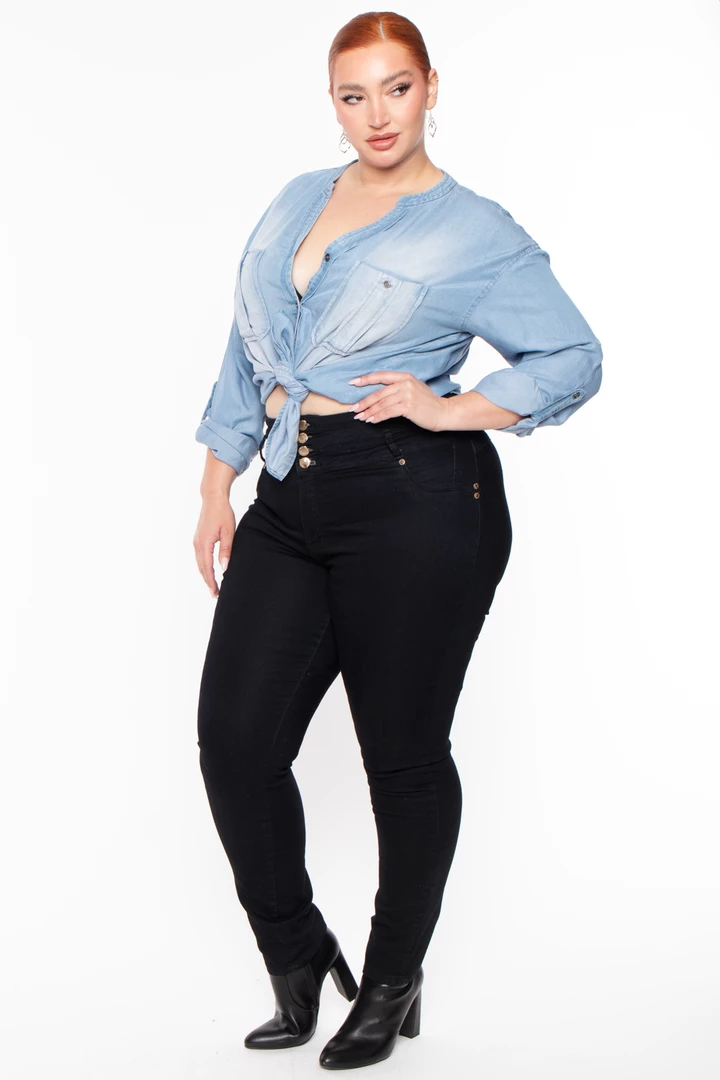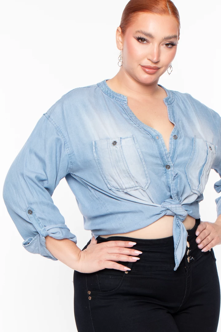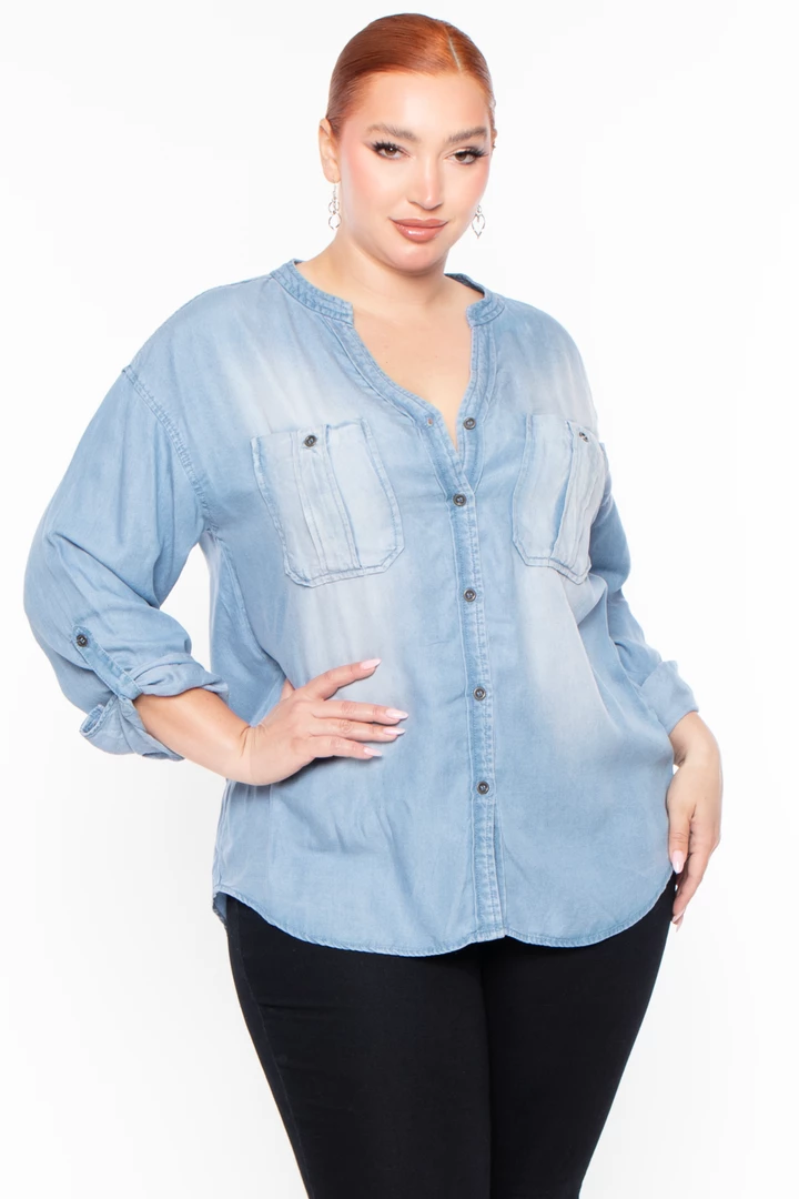 This plus size, woven shirt features adjustable sleeve length, 5 button closure, 2 front pockets, hi-low hemline and mandarin collar