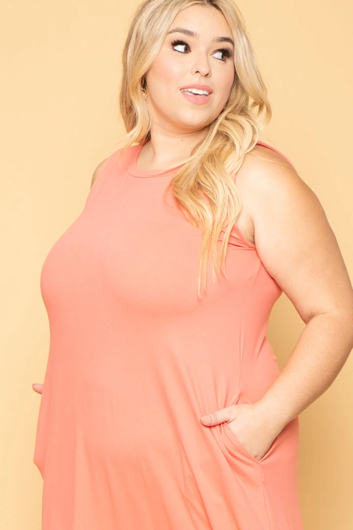 This plus size, stretch knit maxi T-shirt dress features a round neckline, sleeveless cut a curved hem with a side slit, and side-seam pockets very cute sexy and comfy dress